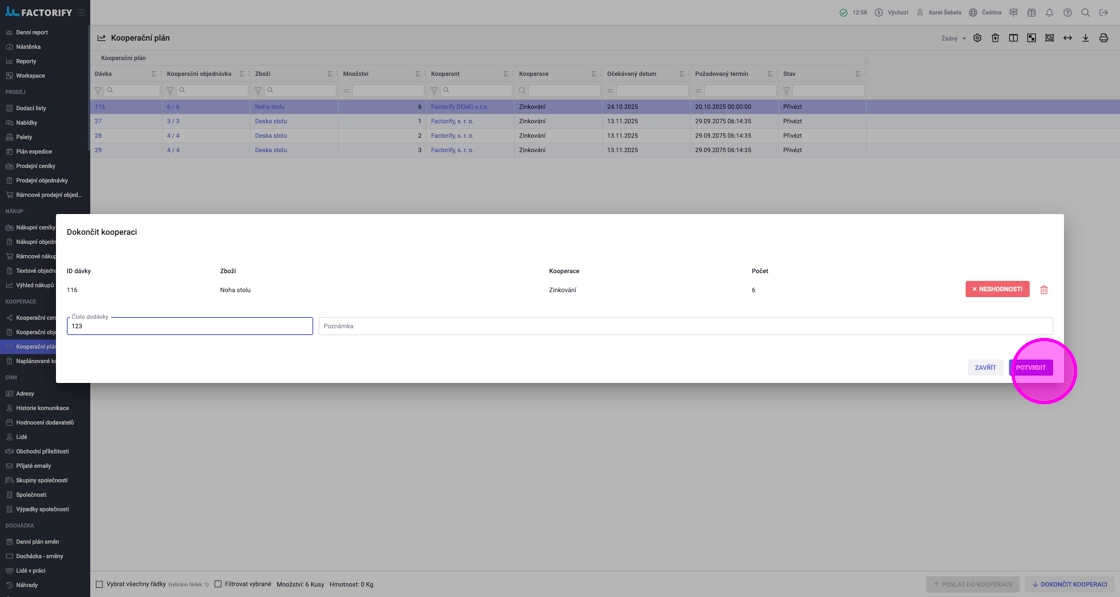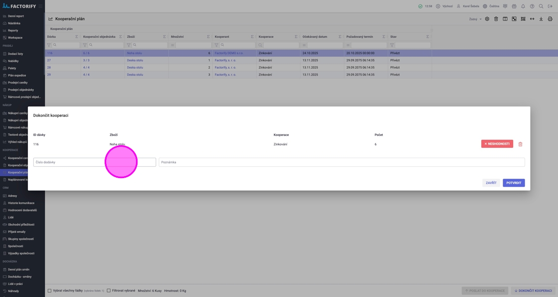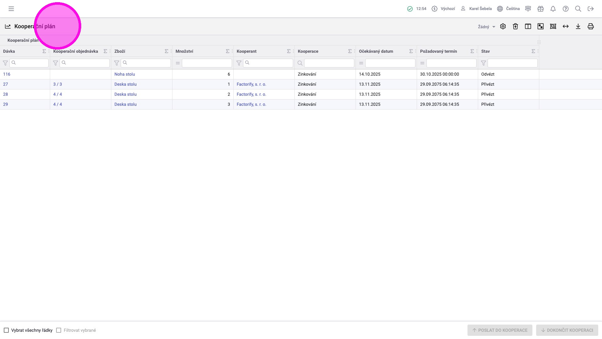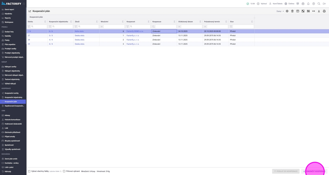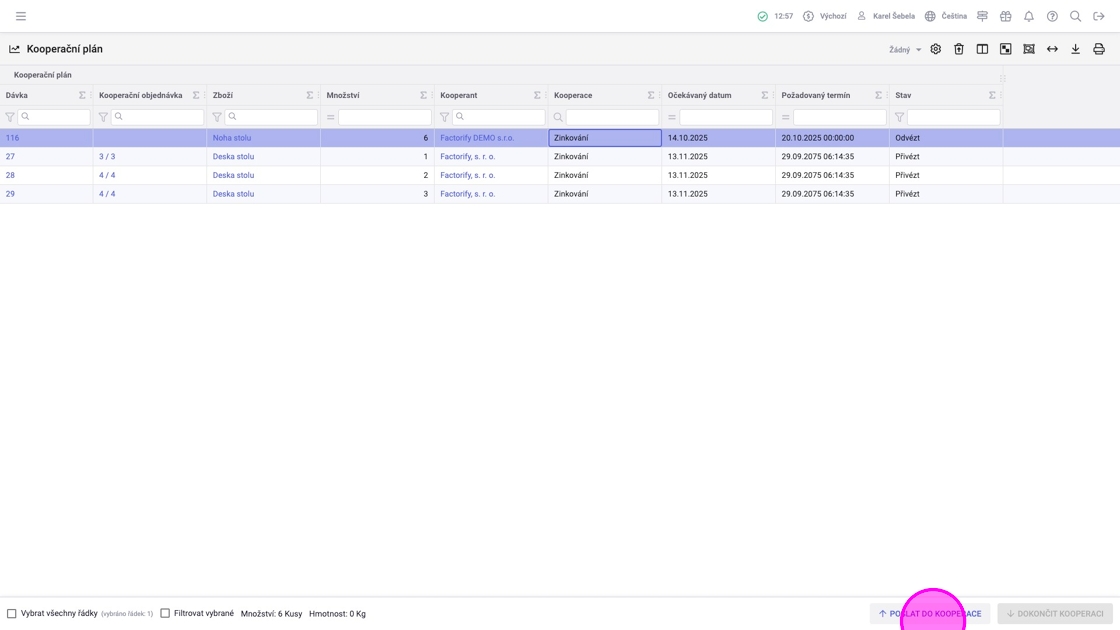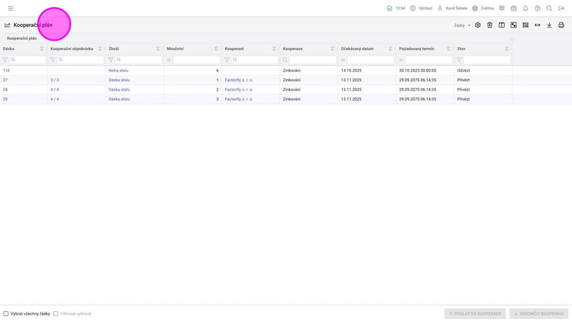 V agendě „Kooperační plán“ vidíte dávky, které jsou přichystané (např. dokončené z předchozích operací) k poslání kooperantovi. Zde je možné sloučit víc dávek a hromadně je poslat kooperantovi a následně přijmout, když se vrátí od kooperanta.