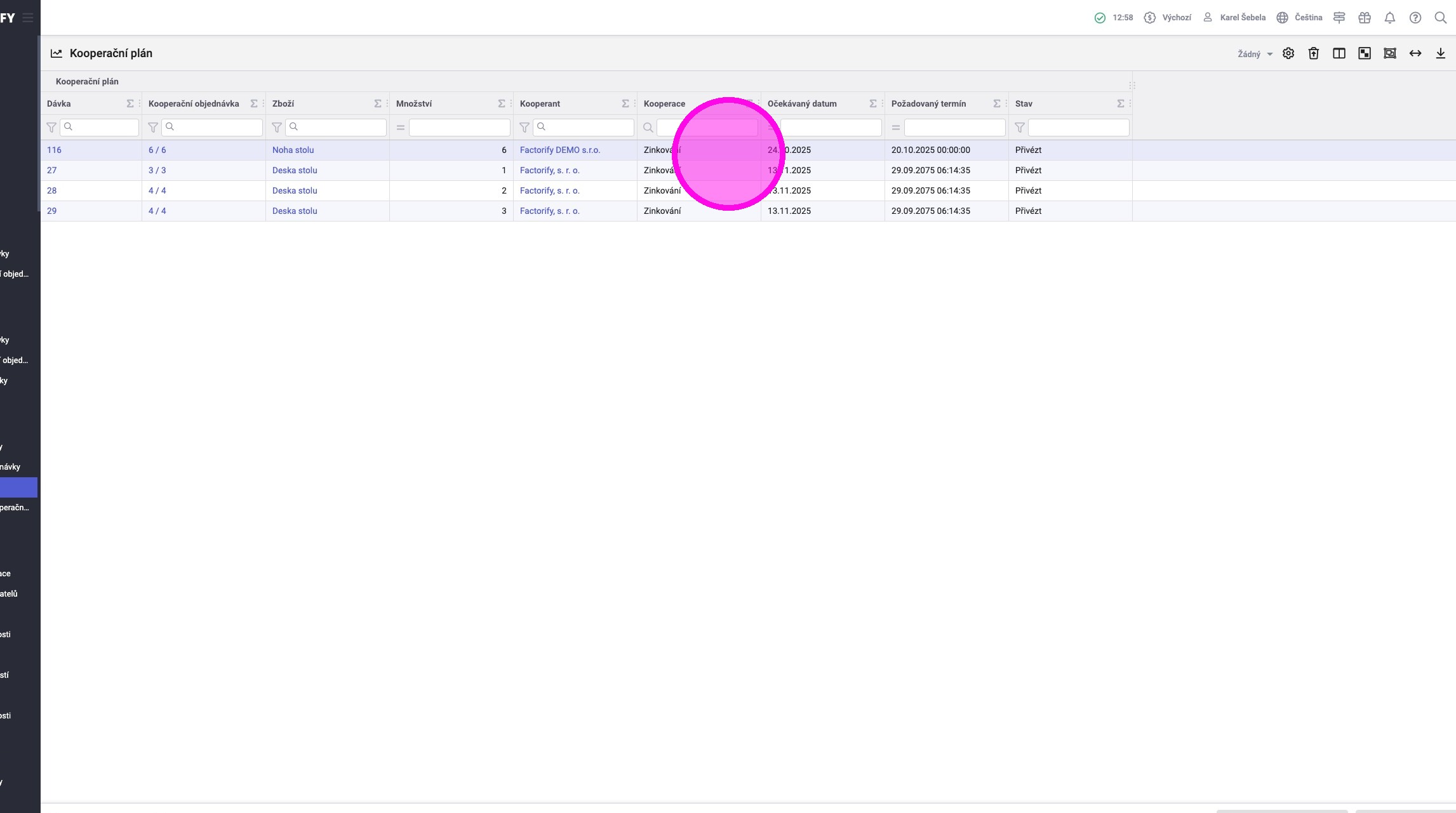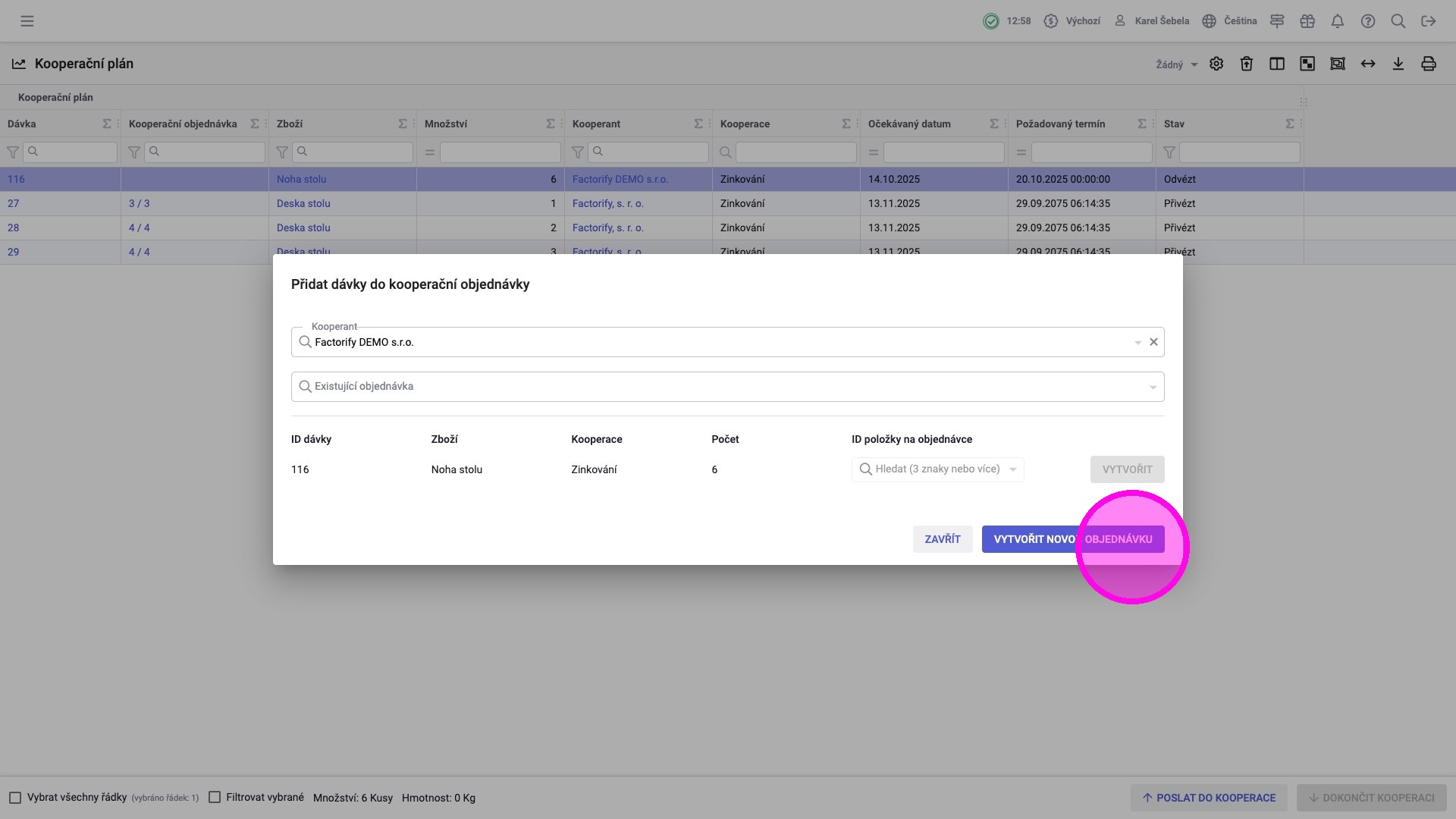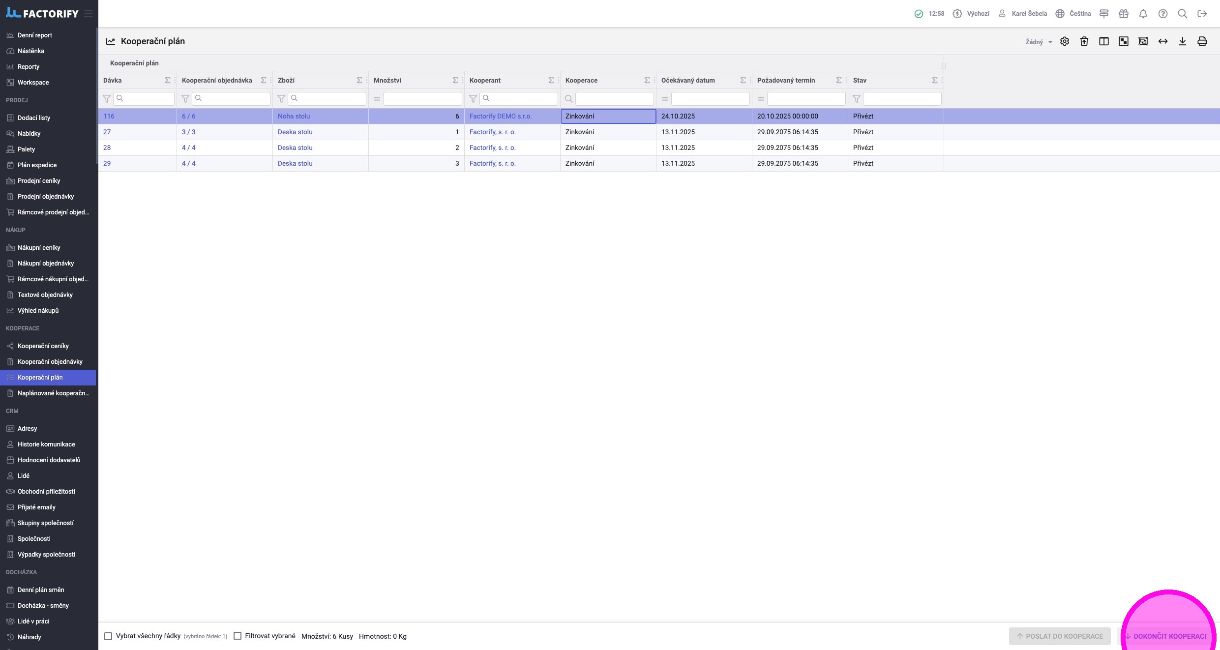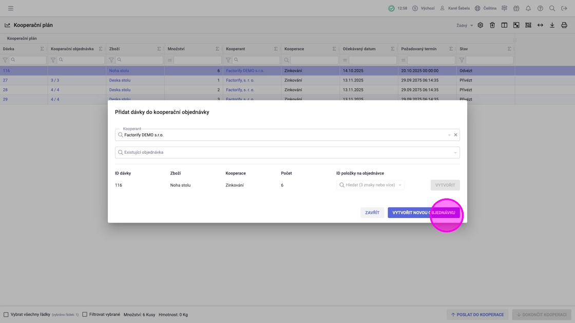 V agendě „Kooperační plán“ vidíte dávky, které jsou přichystané (např. dokončené z předchozích operací) k poslání kooperantovi. Zde je možné sloučit víc dávek a hromadně je poslat kooperantovi a následně přijmout, když se vrátí od kooperanta.