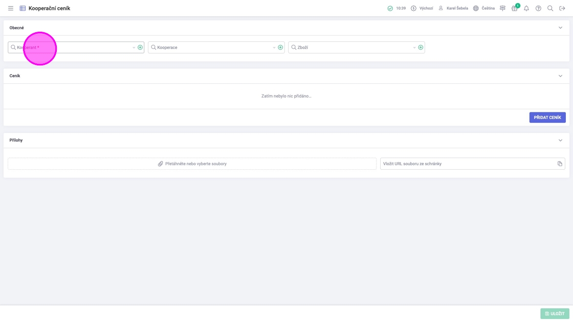 1. V agendě "Kooperační ceníky" kliknout na zelené tlačítko s plusem pro vytvoření nového kooperačního ceníku.