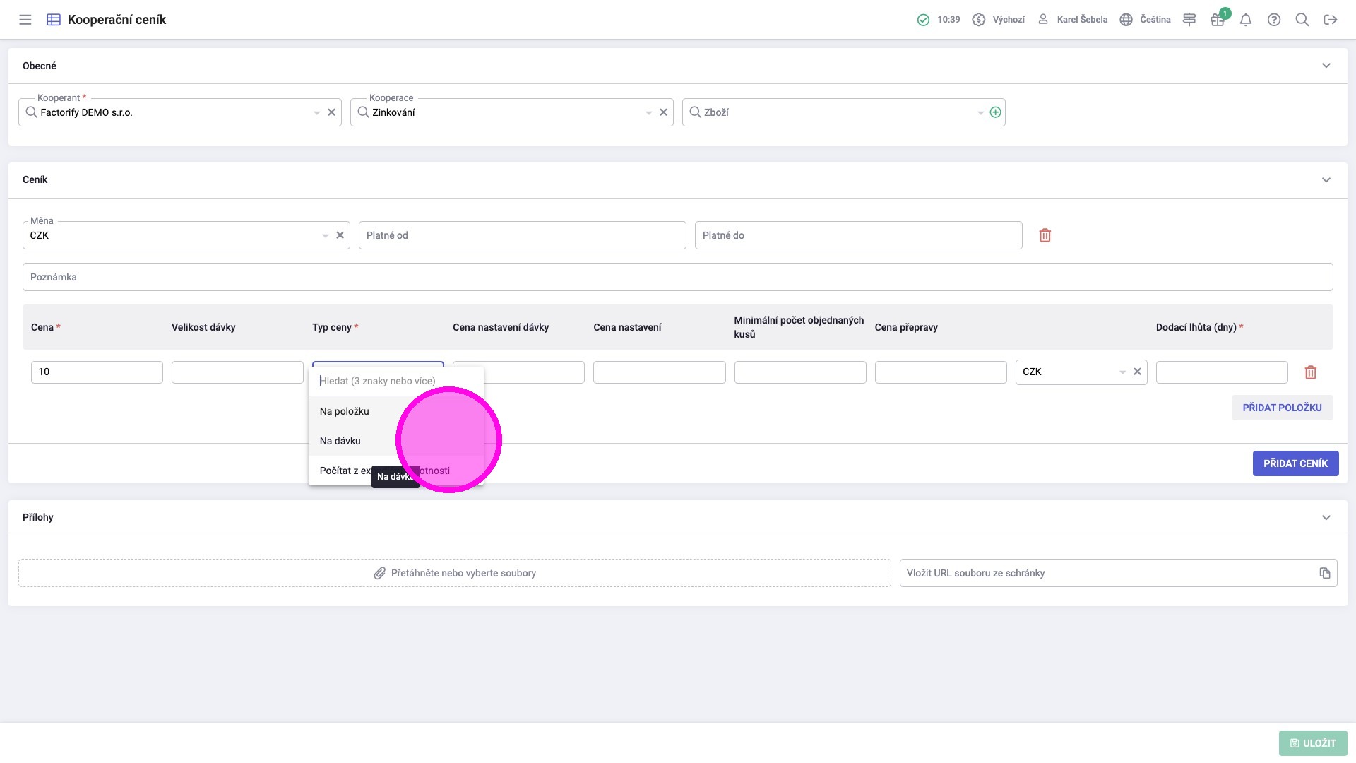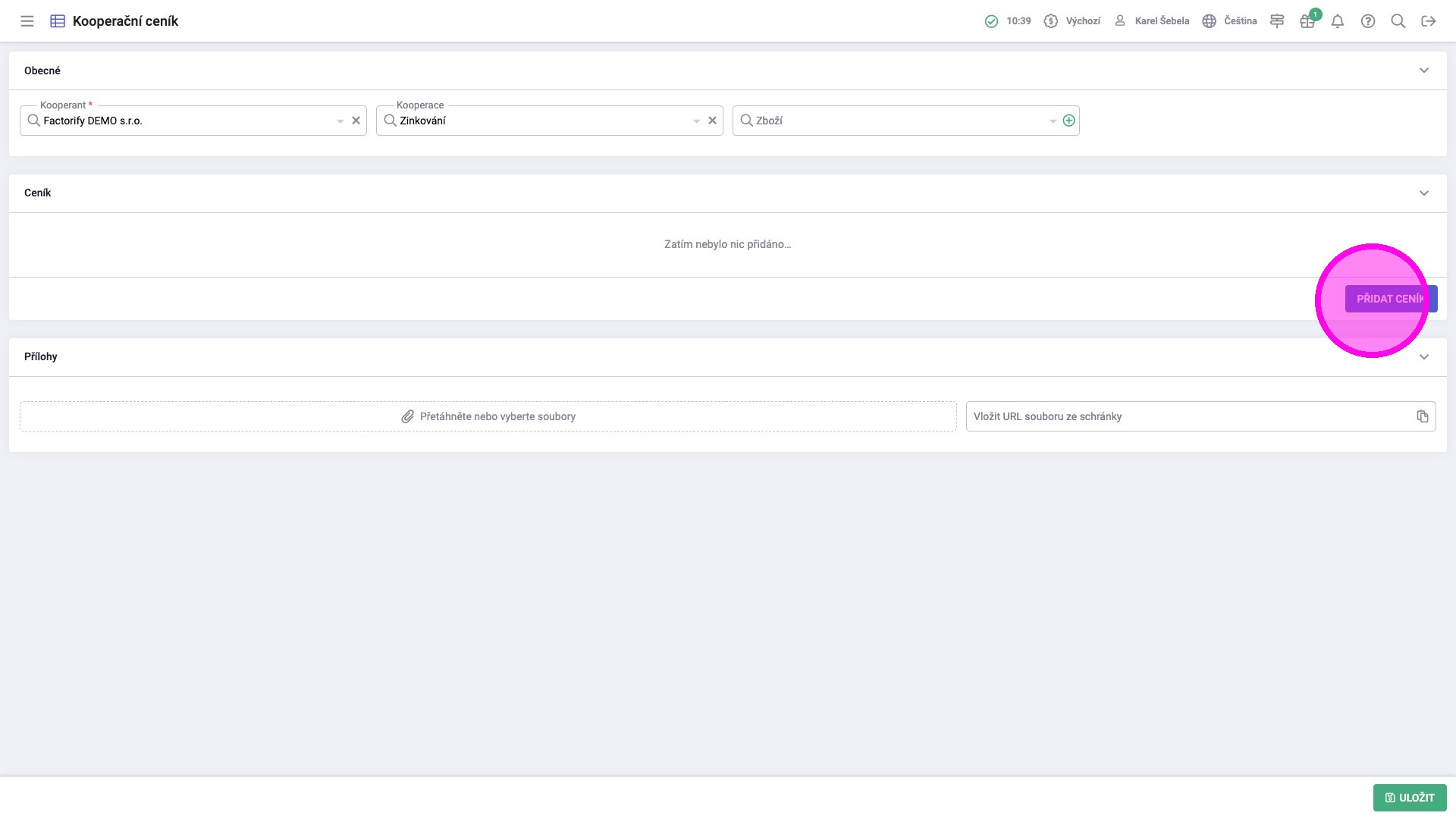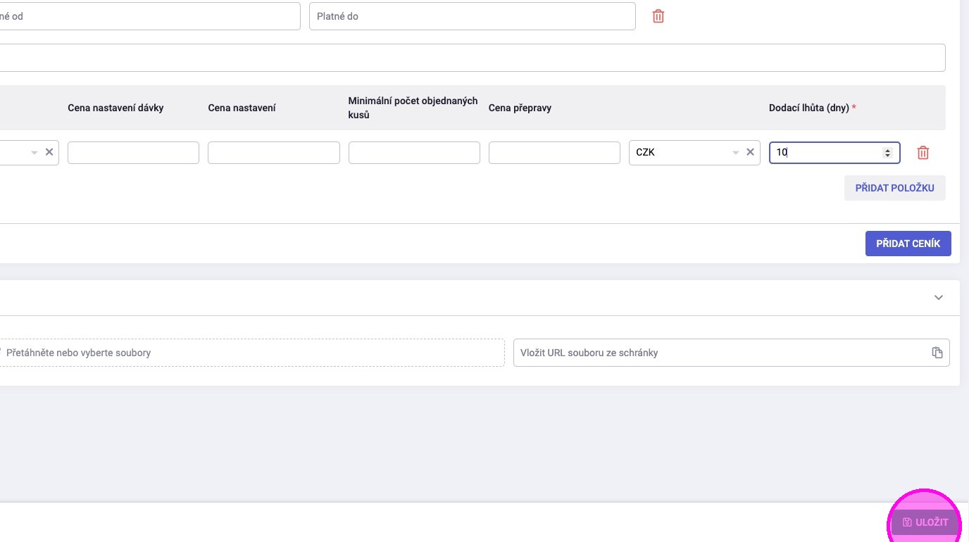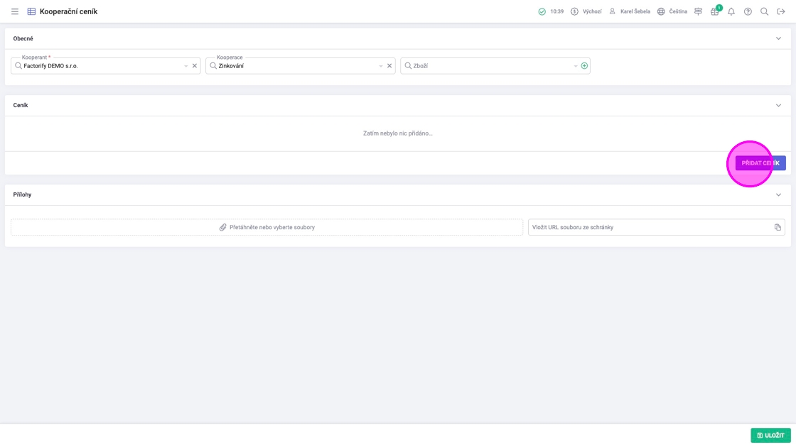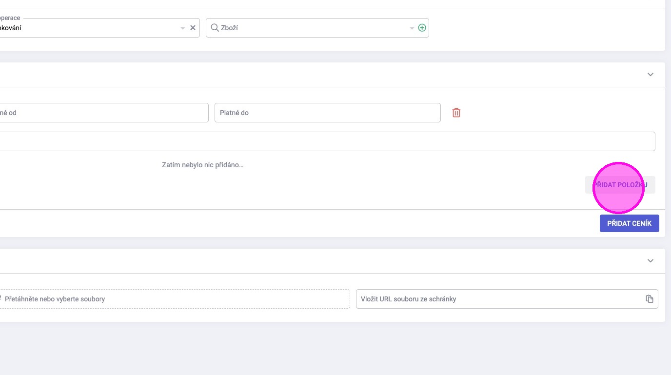 4. Kliknout na „Přidat ceník“.