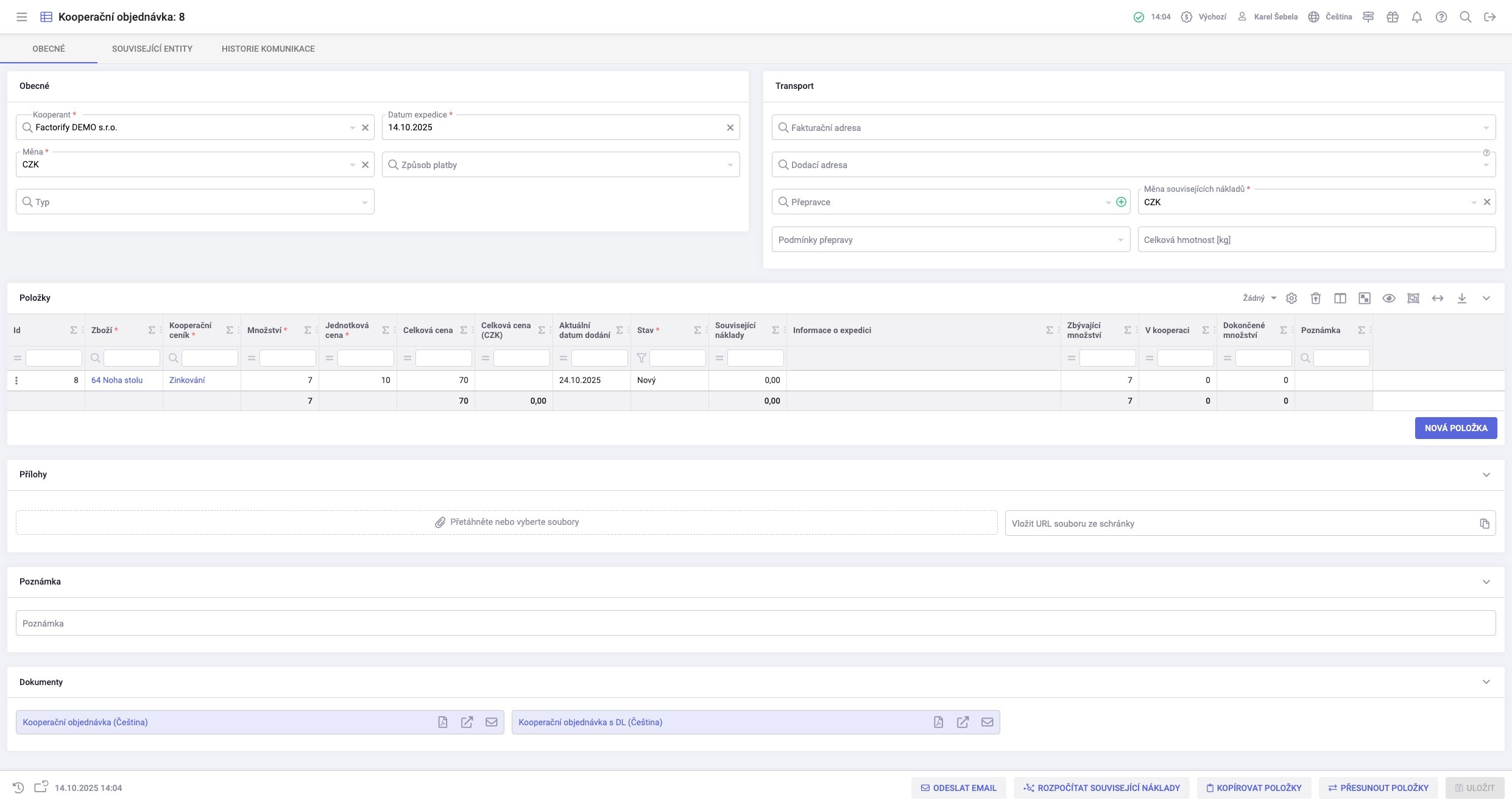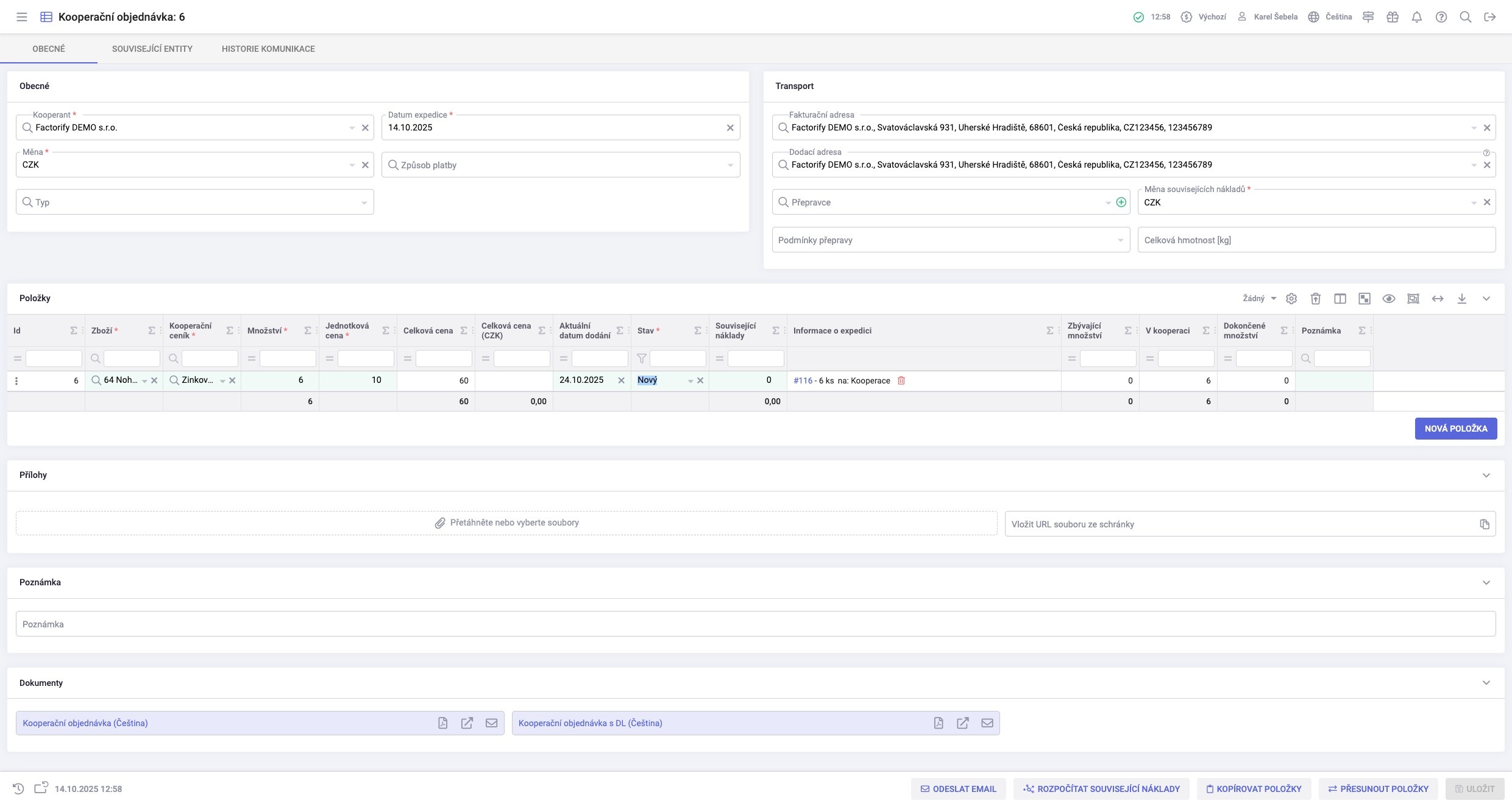 4. Vytvořená kooperační objednávka je již uložená. Nyní ji můžete odeslat mailem.