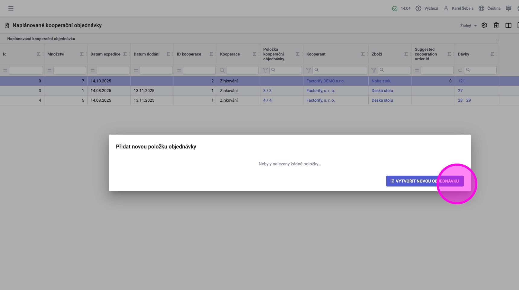 Používané agendy: Kooperačíní objednávky, Kooperační ceníky, Plán kooperace, Naplánované kooperační objednávky