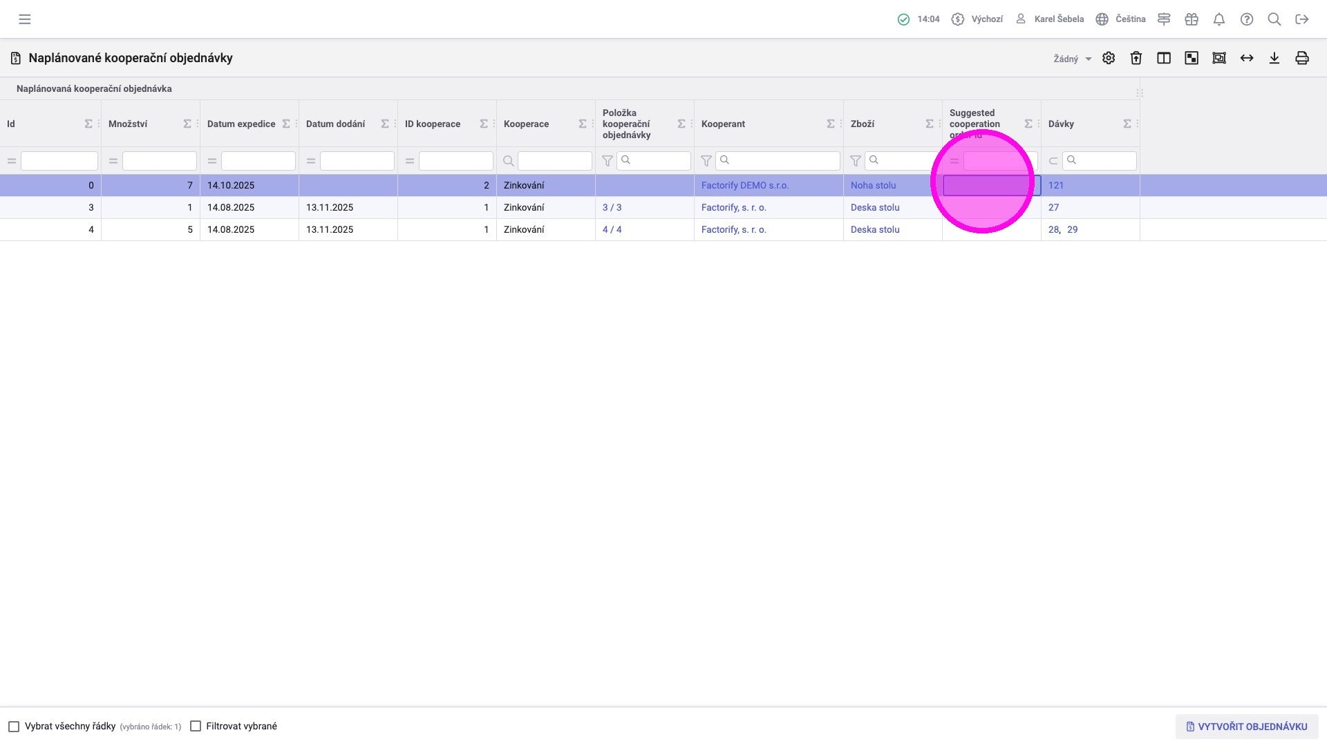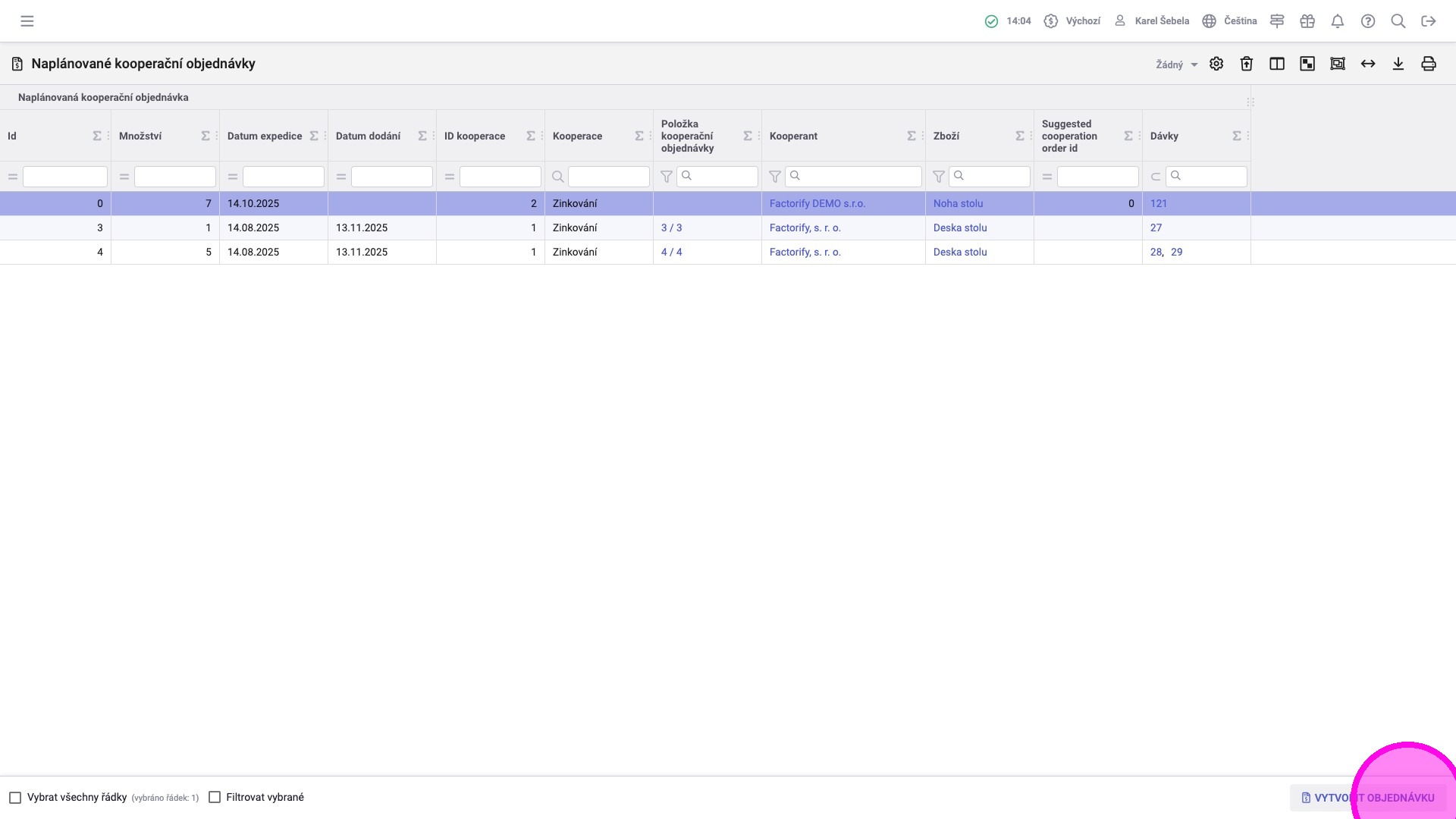 1. Vybrat jednu či více dávek v agendě „Naplánované kooperační objednávky“, ke kterým chcete založit objednávku.