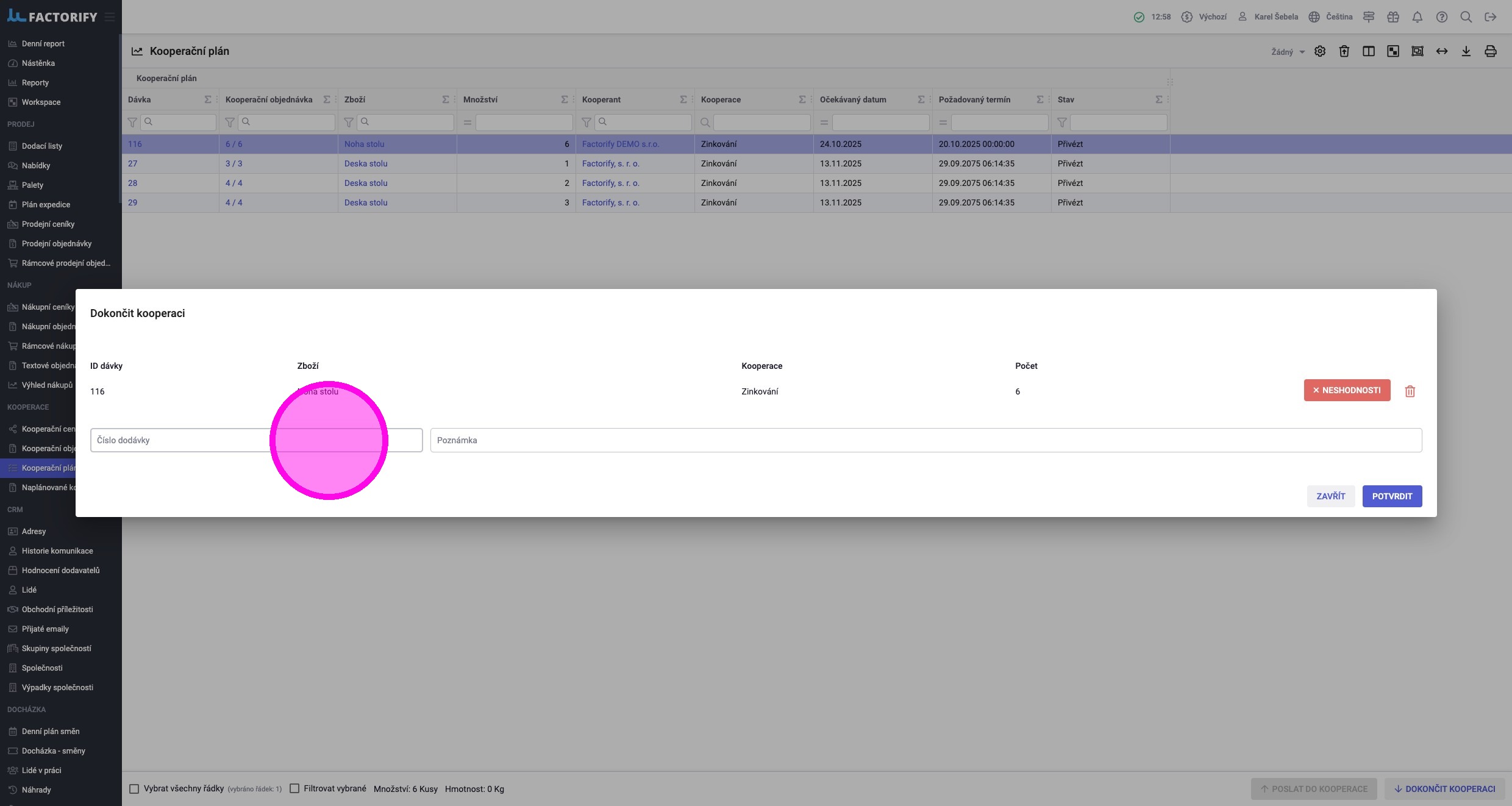8. Kliknout na „Dokončit kooperaci“. Dokončit kooperaci může i skladník ve skladové aplikaci přes možnost Dokončit kooperaci.