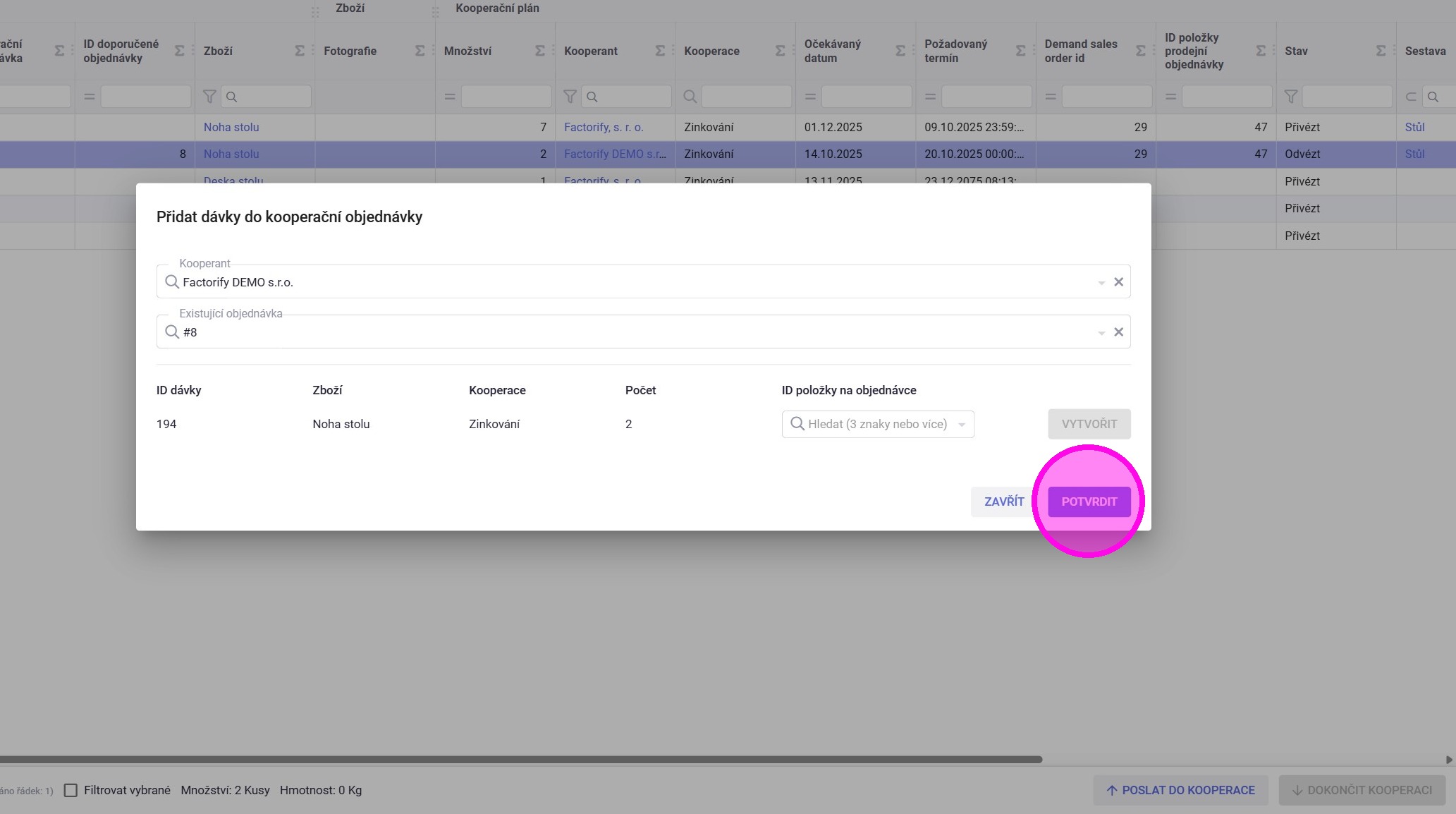 5. V případě, že již existuje kooperační objednávka a obsahuje zboží vyráběné dávkou, kterou odesíláme do kooperace, s kladným "Zbývajícím množstvím", objeví se možnost dávku k navrhované objednávce přiřadit. Aby se tak stalo, musí se kliknout "Potvrdit".