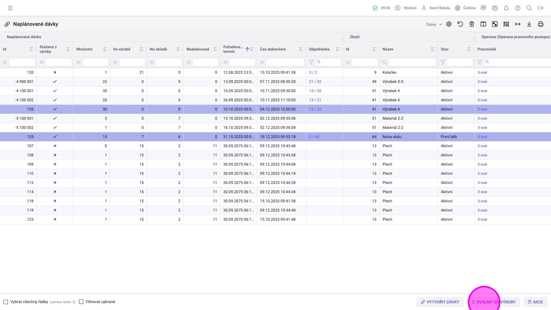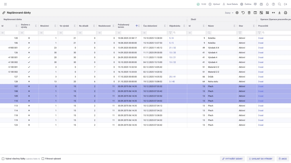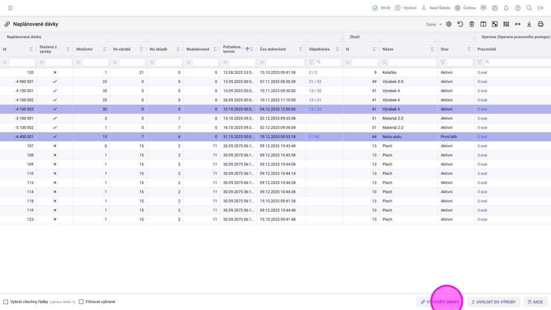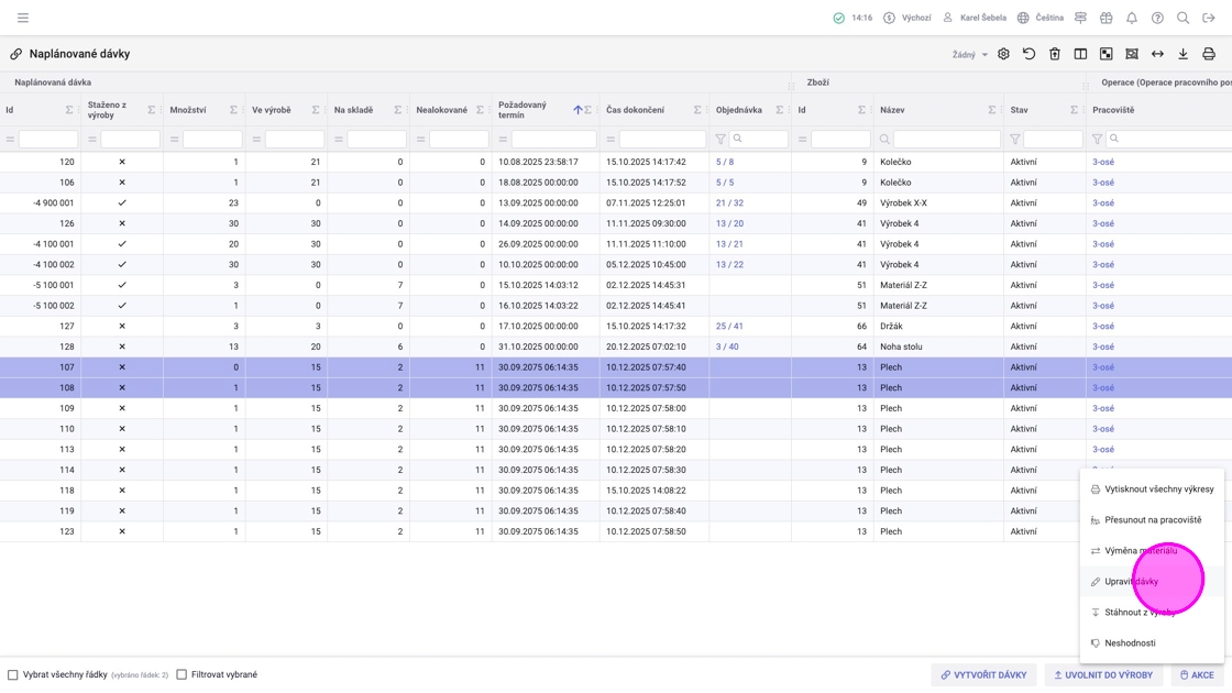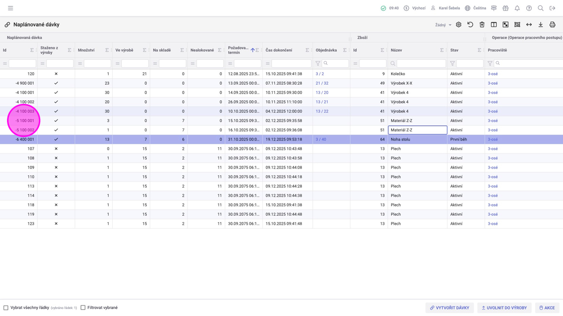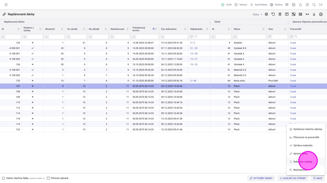 1. V agendě "Naplánované dávky". Označením řádků vybrat dávku či dávky, které chcete stáhnout z výroby.