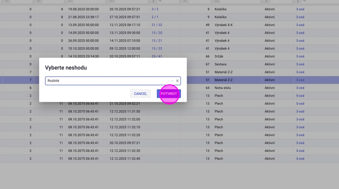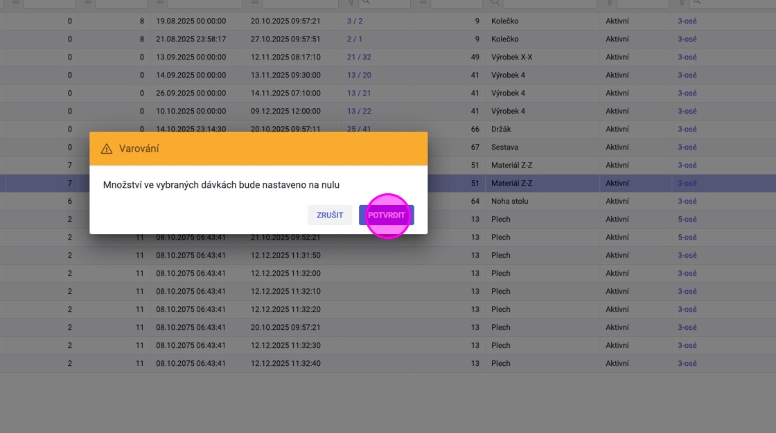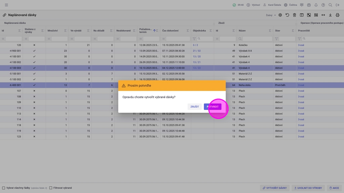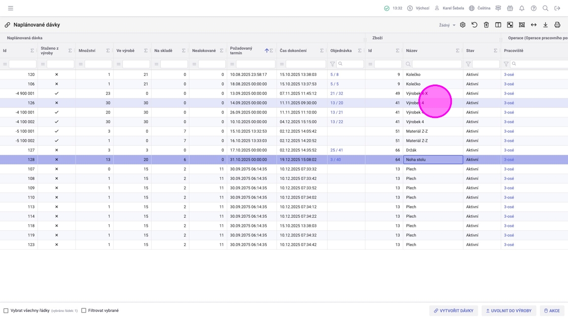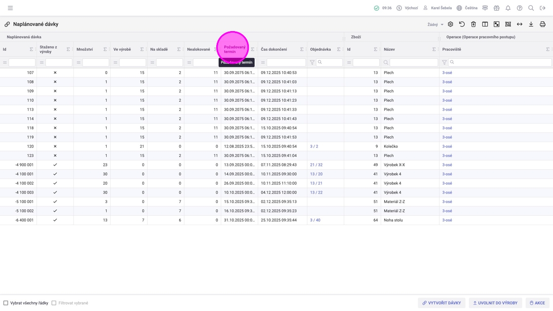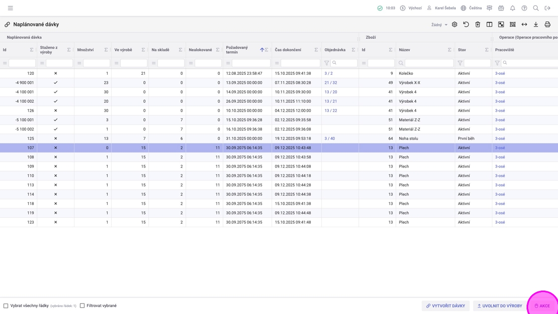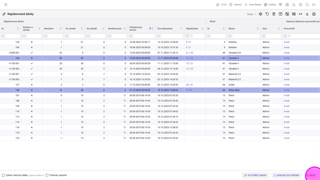 1. V agendě "Naplánované dávky". Označením řádků vybrat dávku či dávky, které chcete stáhnout z výroby.