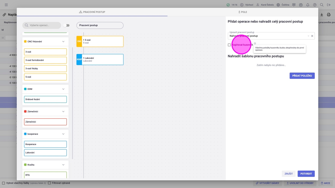 5. Zakliknout „Kopírovat kusovník“ v případě, že chcete přenést i všechen materiál z původního pracovního postupu.