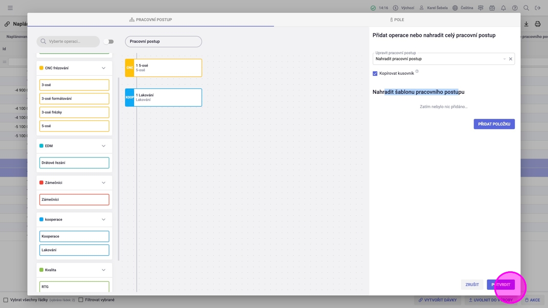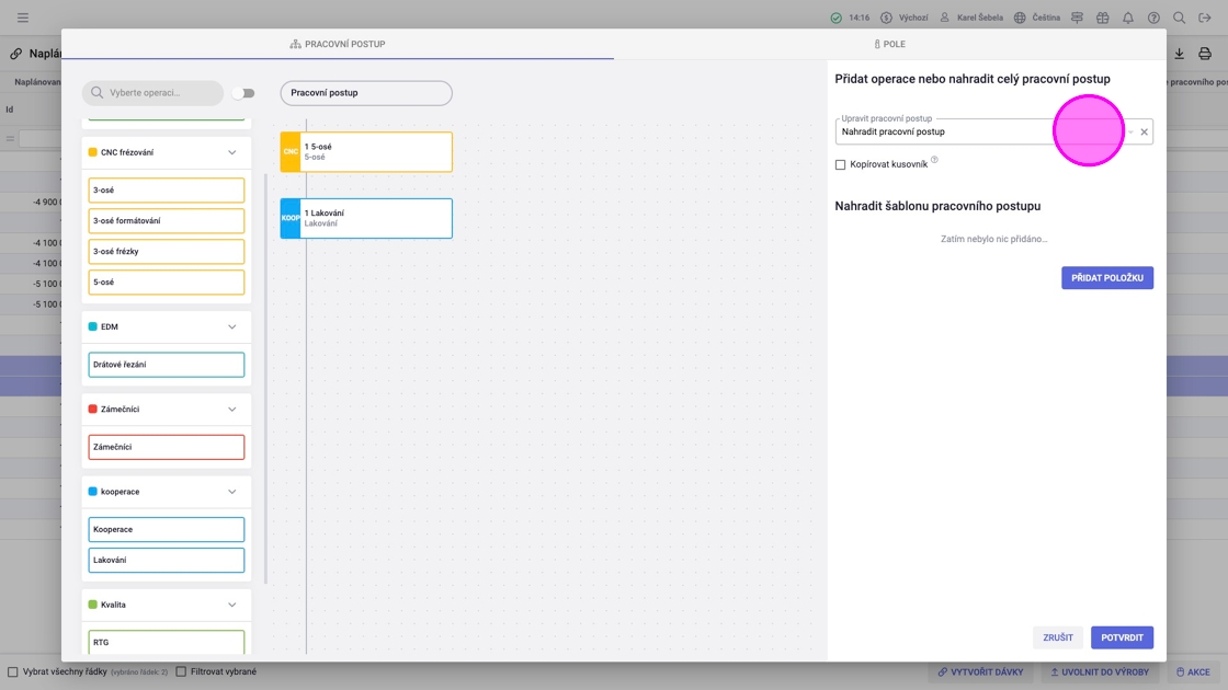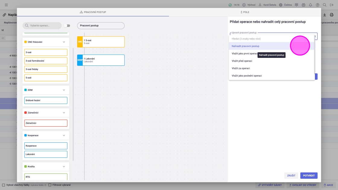 Nahradit pracovní postup – původní postup bude kompletně nahrazen nově zde zadaným.