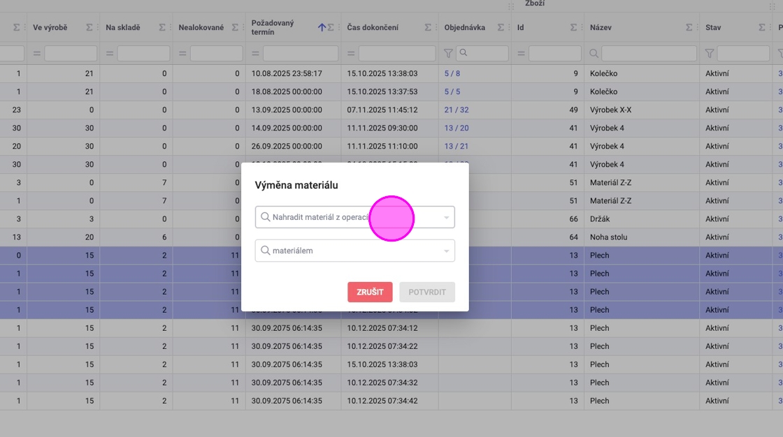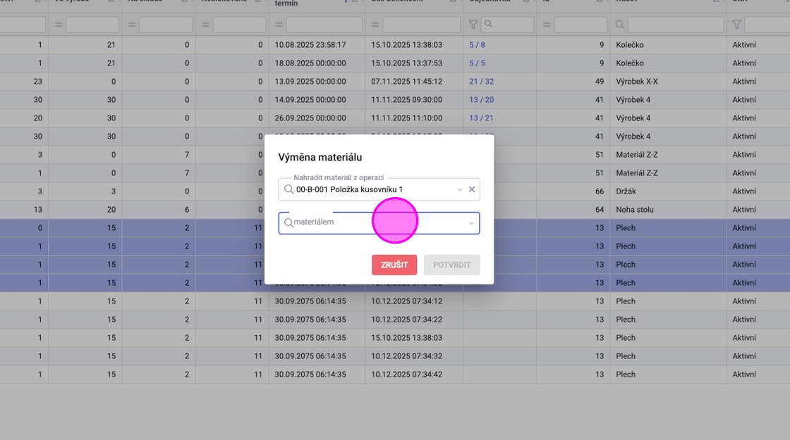 5. Vybrat v poli „Materiálem“ materiál, který nahradí původní materiál ve stejném množství.
