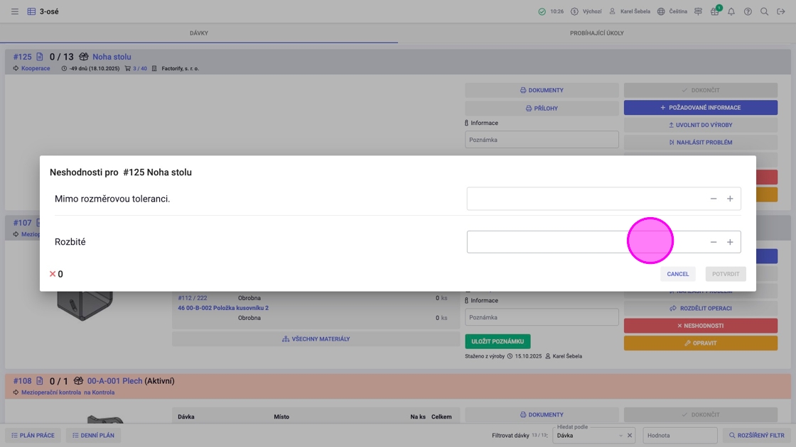 6. Vyberat druh neshodnosti a zadat počet kusů, kolik chcete zrušit z dávky. Pokud celou dávku, zadat všechny kusy.