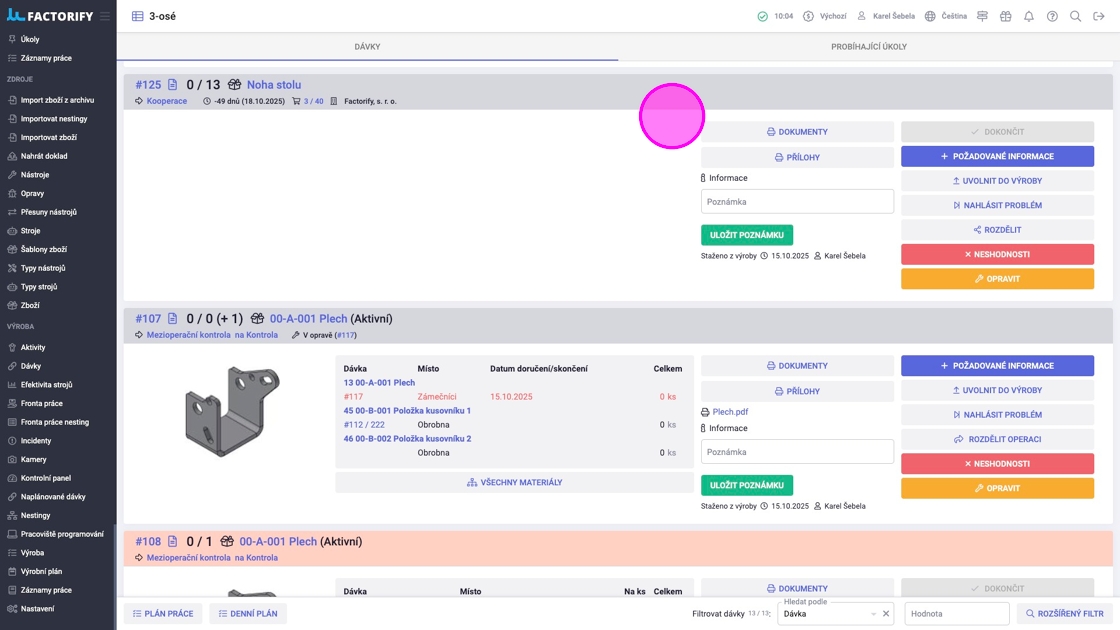 Systém umožní vytisknout výkres ke každé dávce a na druhou stranu papíru vložit QR kód s číslem dávky a pomocné informace o dávce. Tak, aby se dokument přiložil k dávce, která prochází výrobou. Toto je možné tisknout z výrobní obrazovky, když na dávce začínáme pracovat, nebo hromadně, což si ukážeme zde.