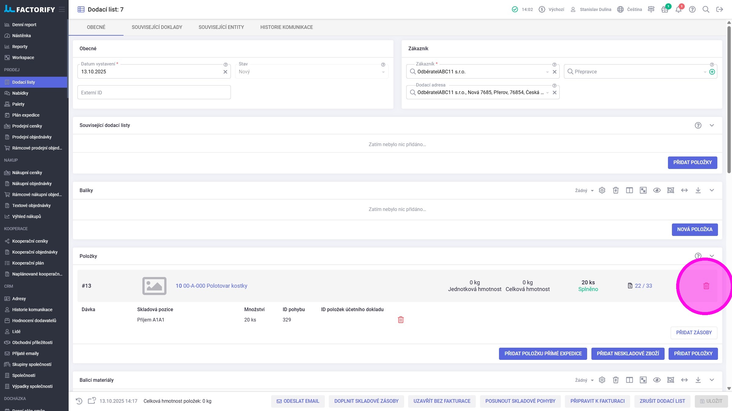 2. Na rušené položce dodacího listu kliknout na ikonu popelnice.
