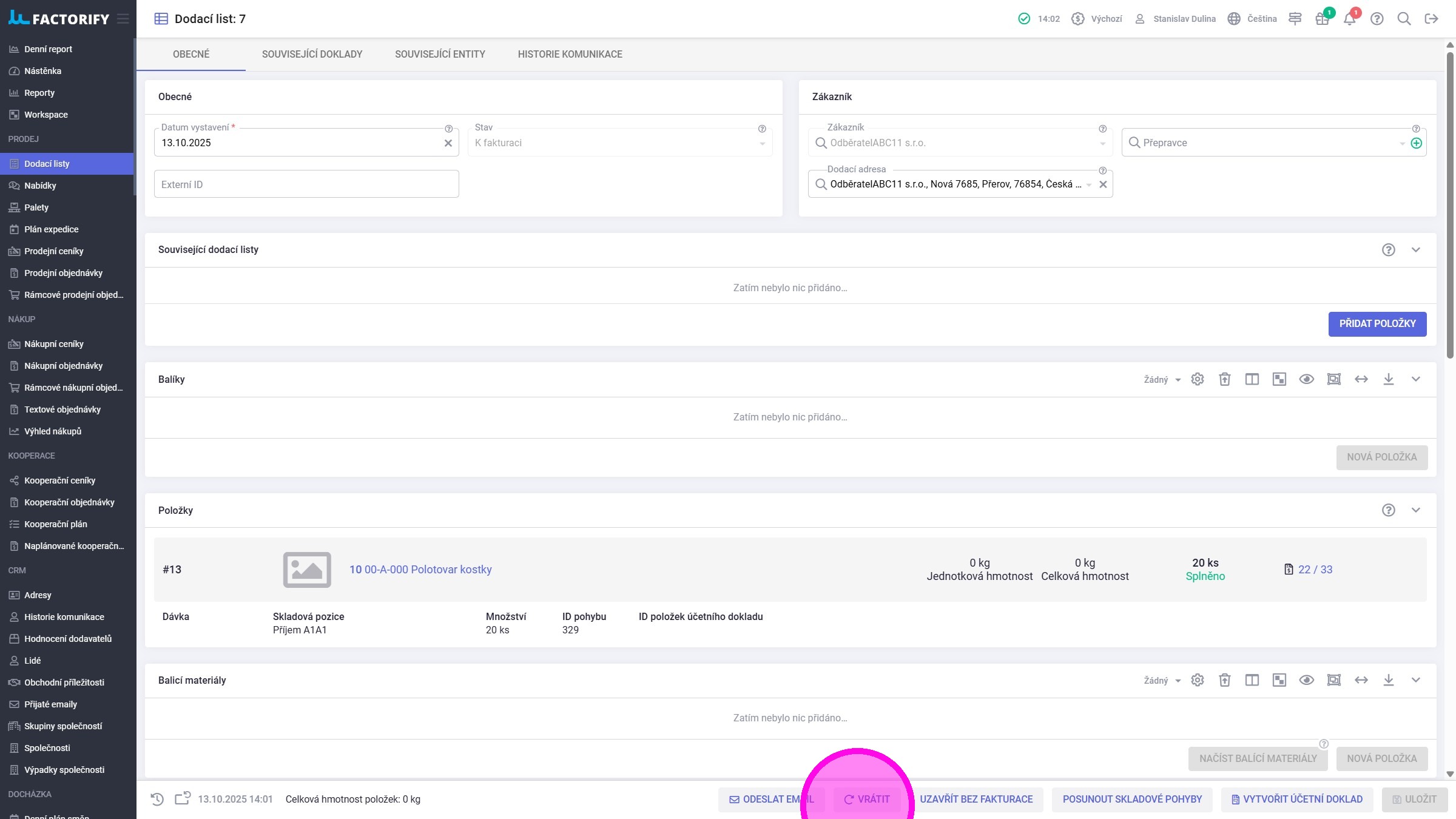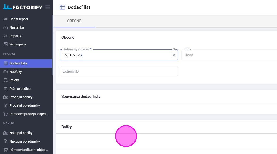 Expedient může zadávat i jednotlivé balíky (například pro potřeby objednání dopravy) a doplnit použitý balicí materiál. Pokud je systém napojen na dopravce, může z detailu dodacího listu rovnou vygenerovat přepravní štítek.