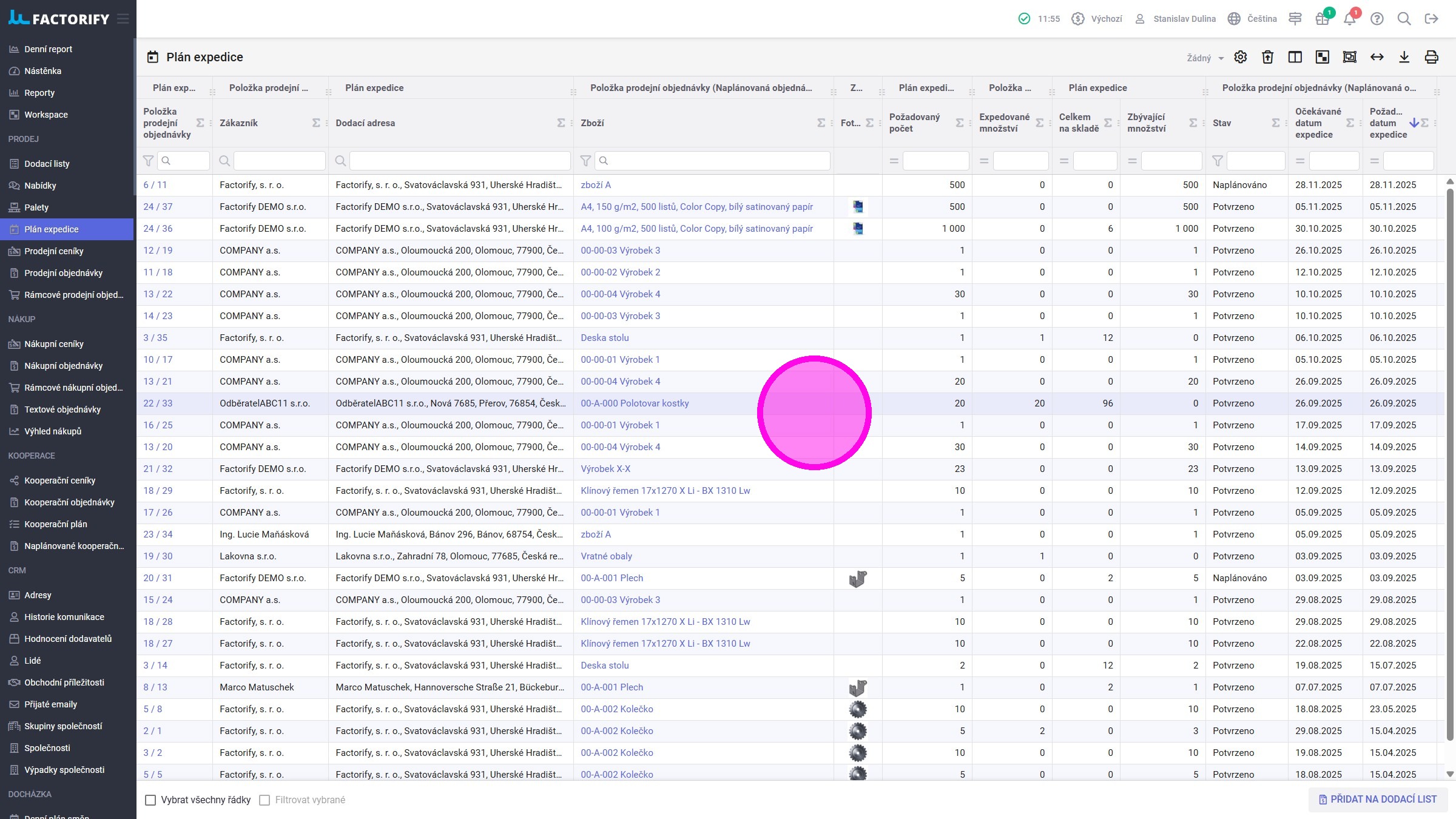 1. V agendě Plán expedice jsou vidět všechny položky naplánovaných prodejních objednávek, tj. objednávek, které jsou ve stavu "Naplánováno" a "Potvrzeno". Doporučené řazení položek je dle dodací adresy zákazníka nebo dle data expedice, jak je vidno v náhledu. Dále se pak nabízí filtrování dle sloupce "Celkem na skladě", aby expedient viděl jen objednávky, které opravdu může expedovat.