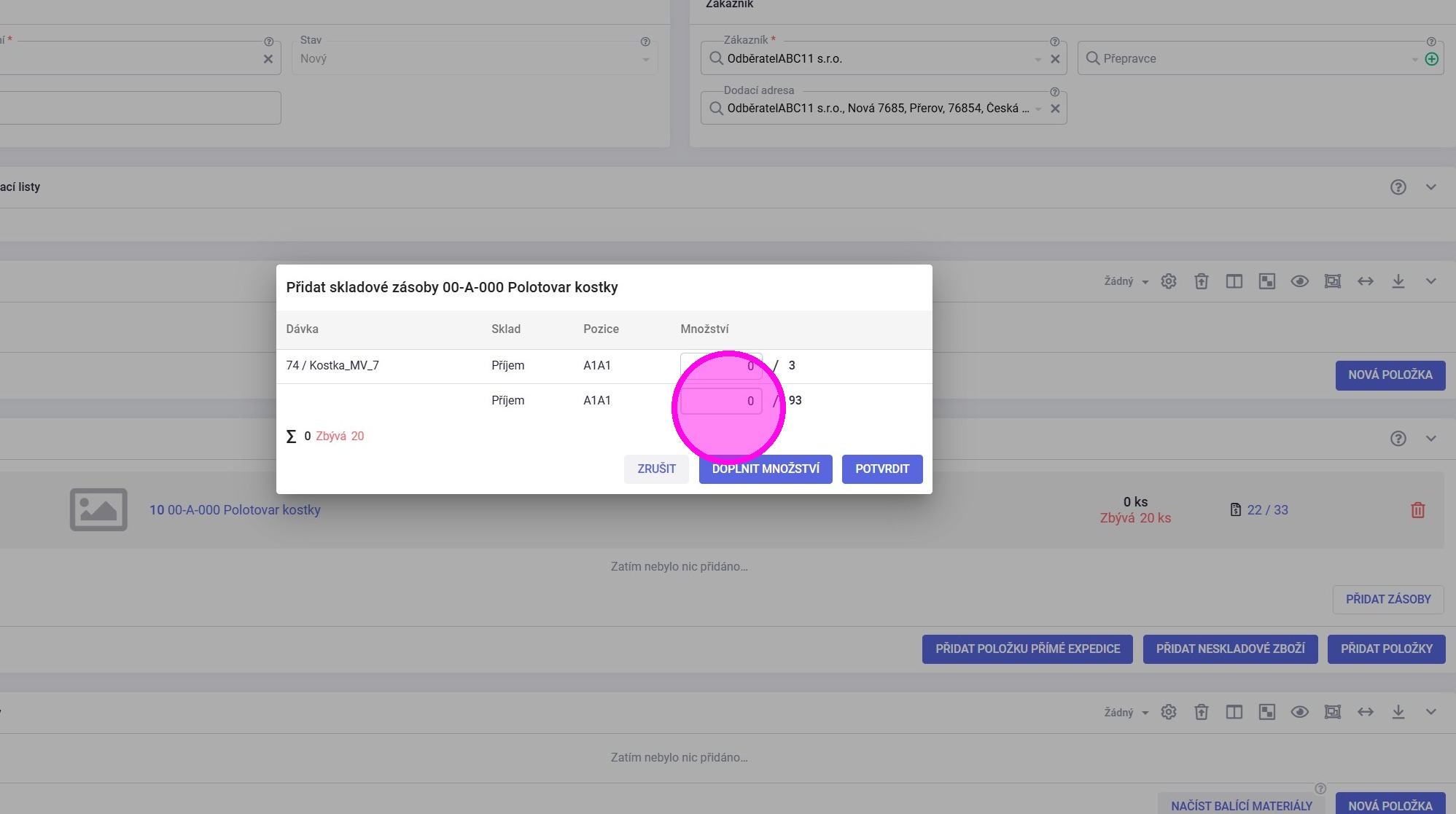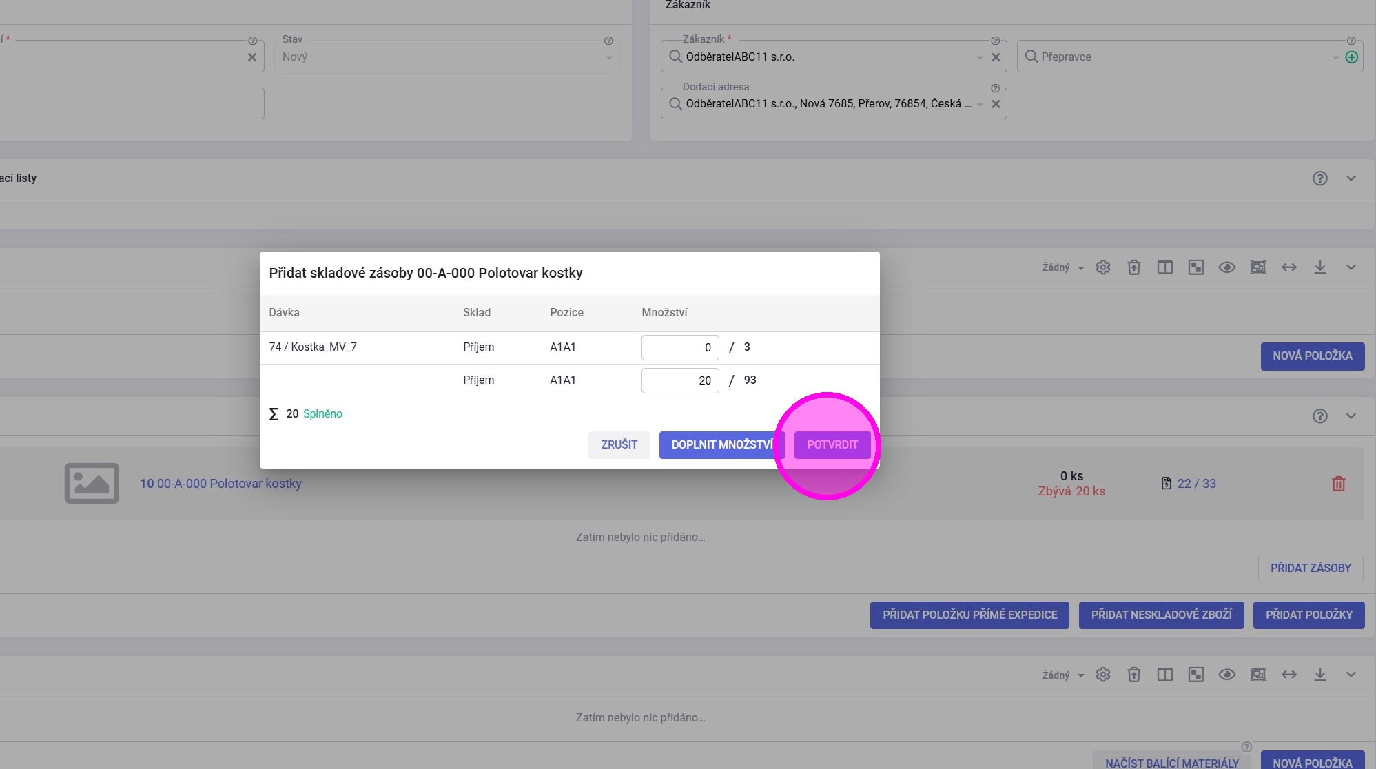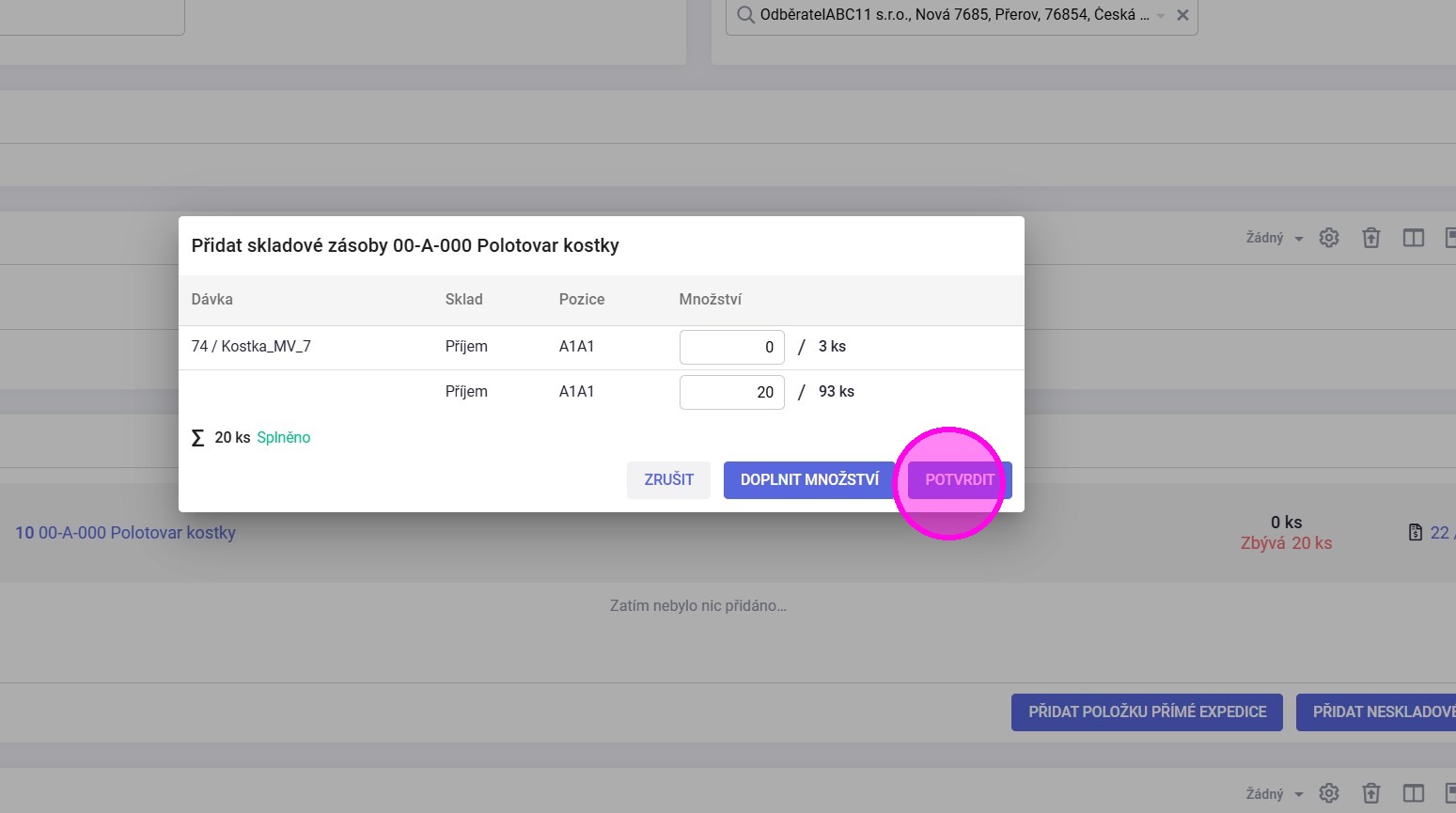 Poté jen stačí vybrat položky objednávek určené k expedici. Je potřeba vybírat položky objednávky pro jednoho zákazníka a jednu dodací adresu. Zároveň je potřeba mít skladem dostupné dostatečné množství zásob alespoň pro částečné naplnění objednávky.