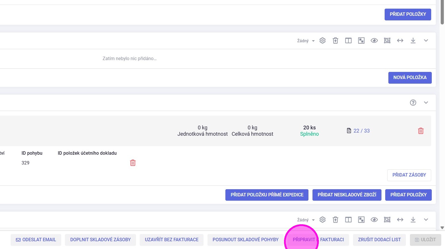 8. Pokud je dodací list kompletní, kliknout na "Připravit k fakturaci". Popřípadě na "Uzavřít bez fakturace", pokud se k dodacímu listu nechce vystavit faktura.