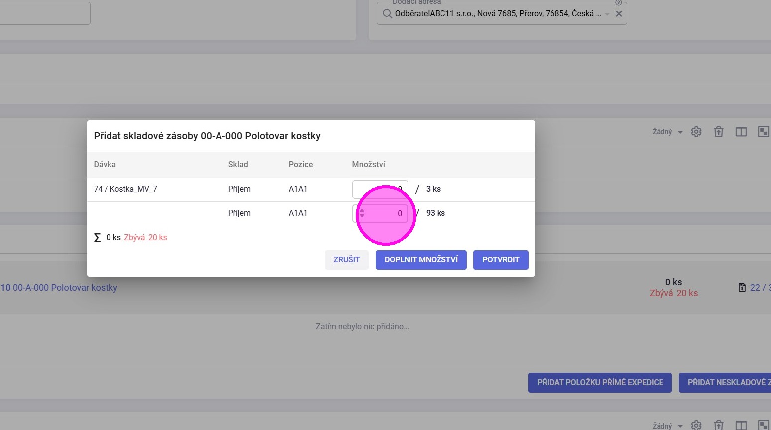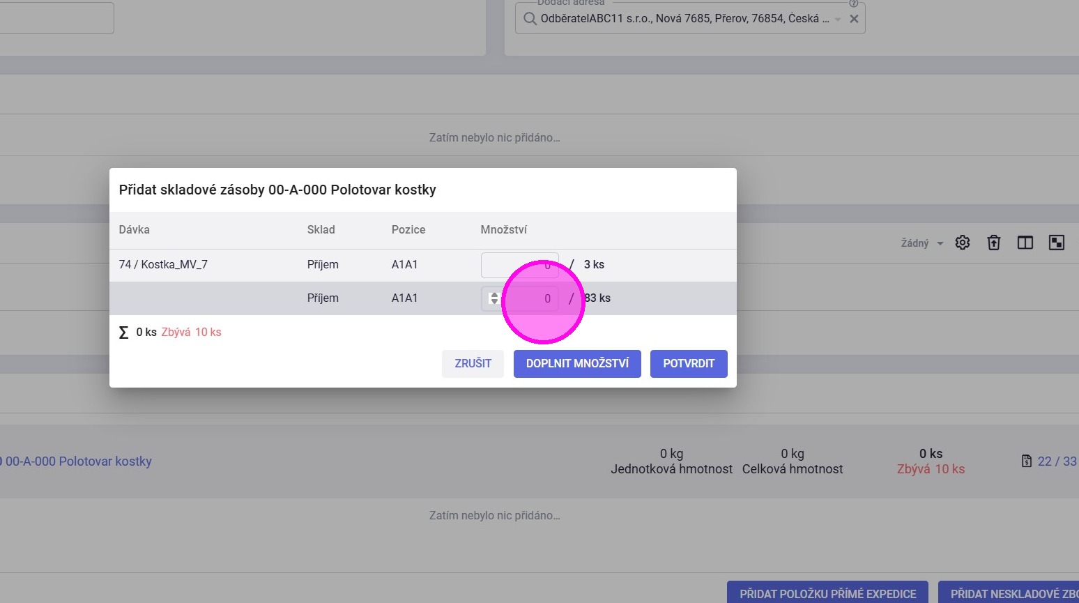 3. Vybrat, jaké zásoby a v jakém množství chci na dodací list vydat. Popř. kliknout na tlačítko "Doplnit množství", které automaticky doplní zásoby dle FIFO.
