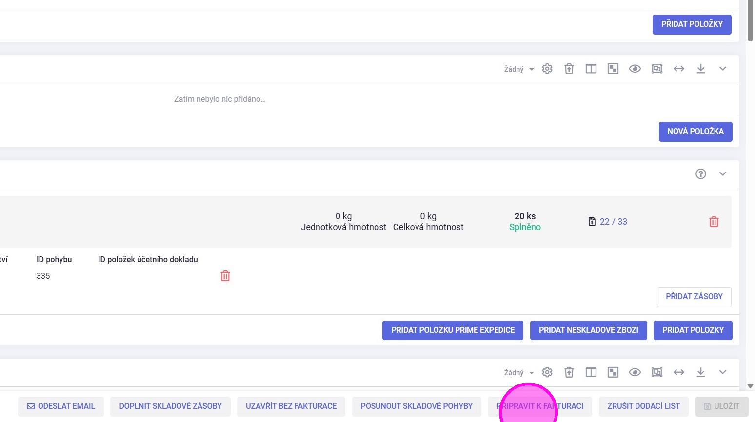 6. Pokud je dodací list kompletní, kliknout na "Připravit k fakturaci". Popřípadě na "Uzavřít bez fakturace", pokud se k dodacímu listu nechce vystavit faktura.