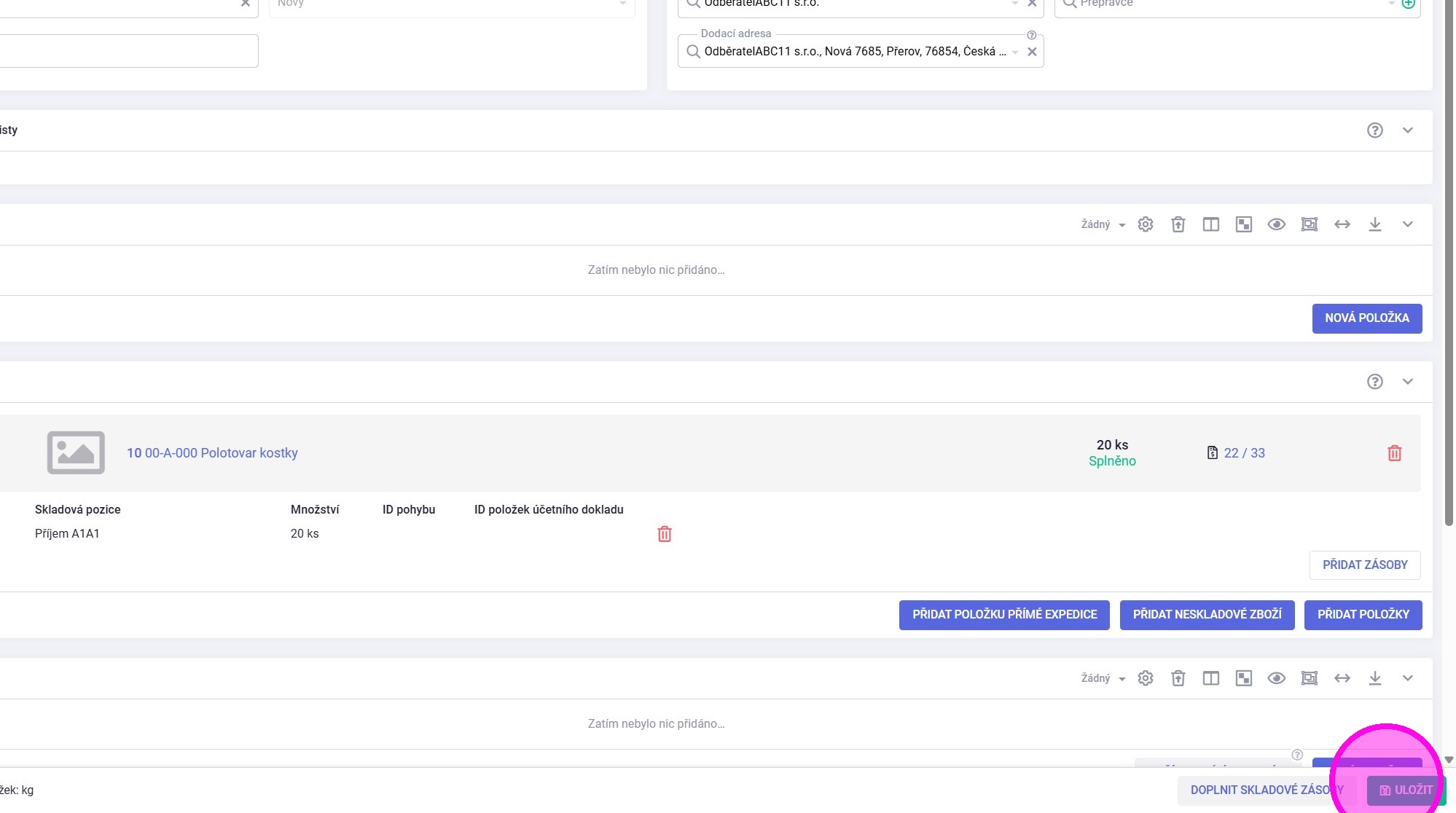 Tip: V tomto kroku je možné kliknout na tlačítko "Doplnit skladové zásoby". Tím se přeskočí kroky 7 a 8 a do dodacího listu budou doplněny skladové zásoby dle FIFO pro všechny položky dodacího listu.