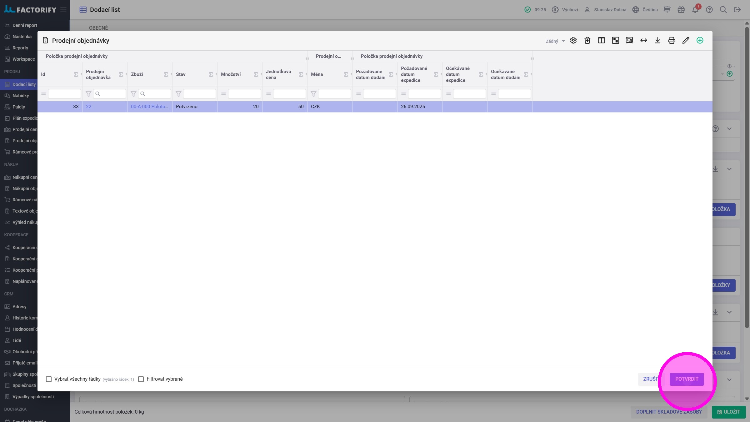 1. Funkce vytvoření dodacího listu přímo z prodejní objednávky je dostupná v případě, kdy je objednávka ve stavu "Potvrzeno" a zásoba potřebná pro naplnění objednávky je dostupná na skladu.