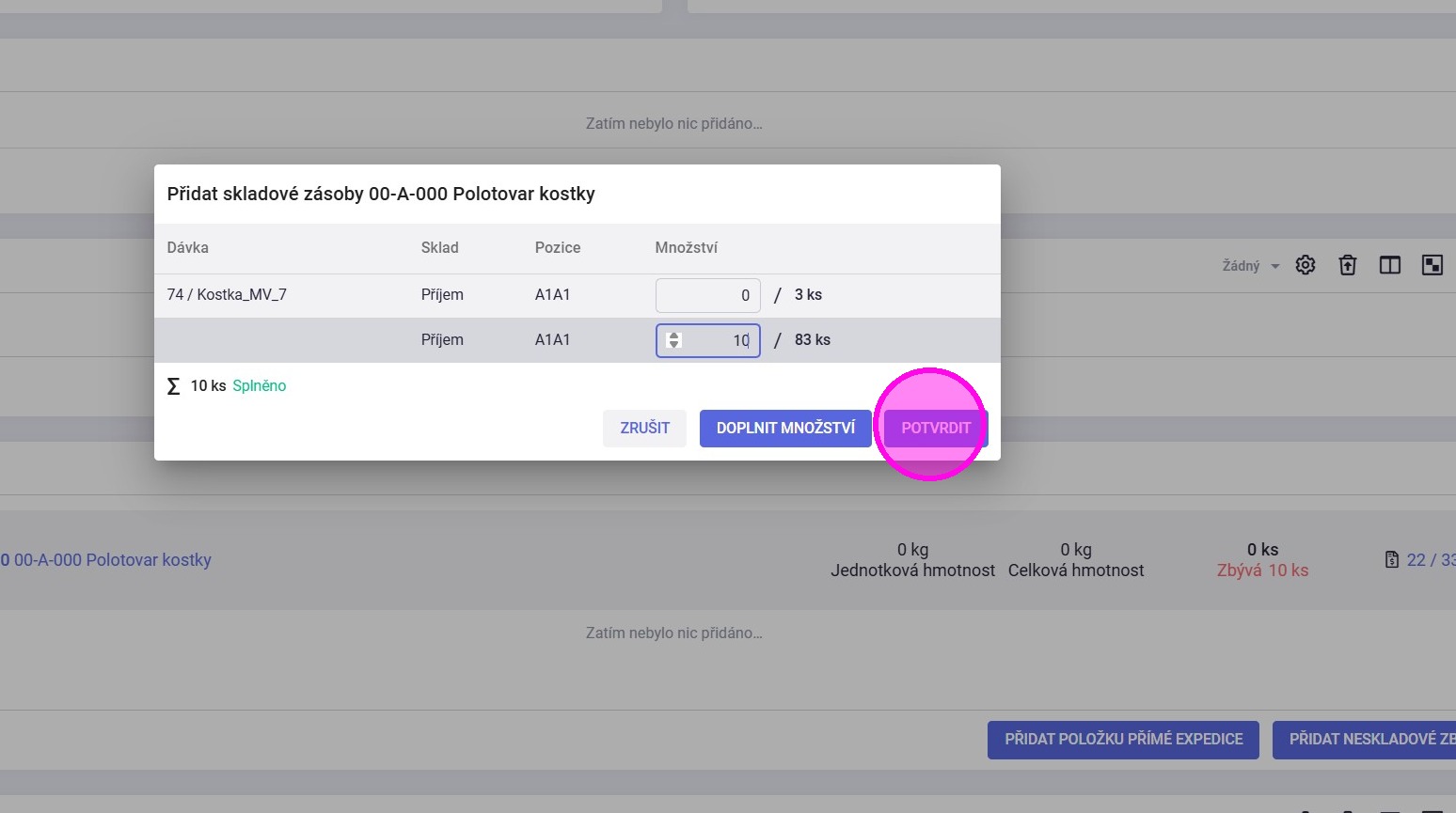 Tip: V tomto kroku je možné kliknout na tlačítko "Doplnit skladové zásoby". Tím se přeskočí kroky 5 a 6 a do dodacího listu budou doplněny skladové zásoby dle FIFO pro všechny položky dodacího listu.