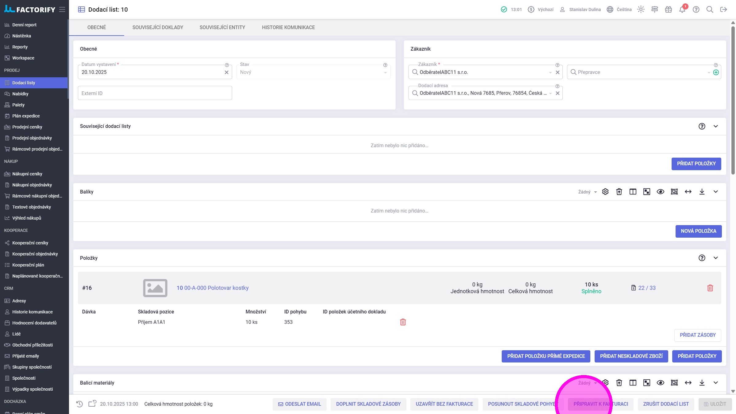 10. Pokud je dodací list kompletní, kliknout na "Připravit k fakturaci". Popřípadě na "Uzavřít bez fakturace", pokud se k dodacímu listu nechce vystavit faktura.