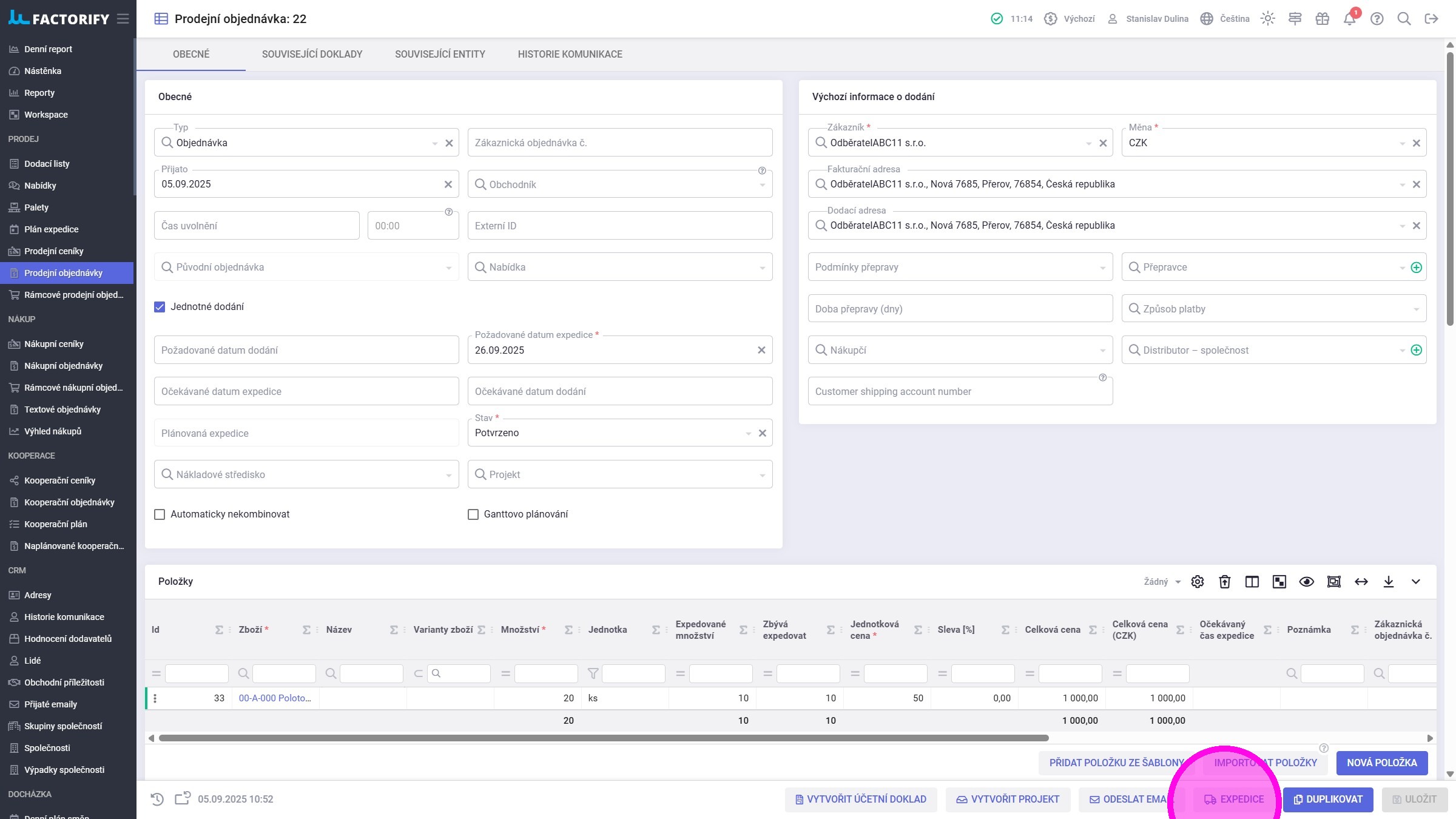 Na detailu prodejní objednávky kliknout na tlačítko "Expedice". Po kliknutí je vytvořen nový dodací list.