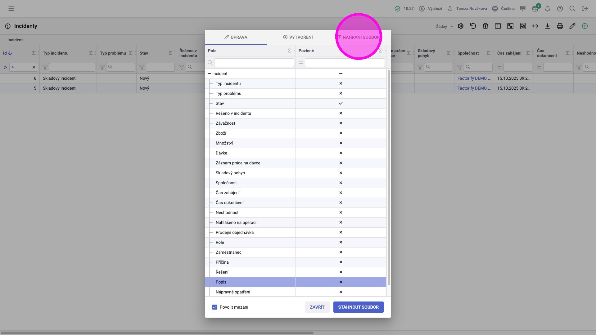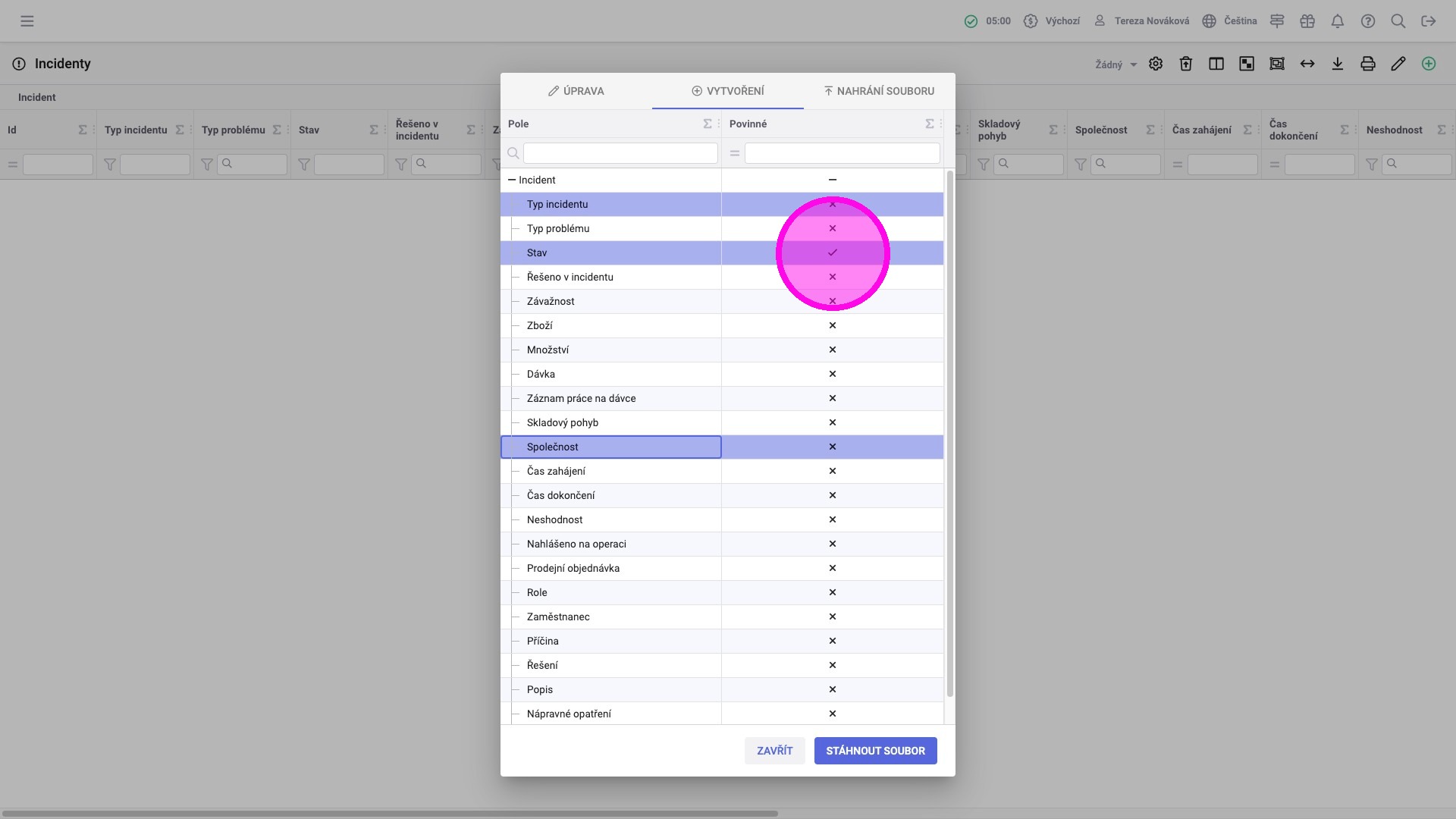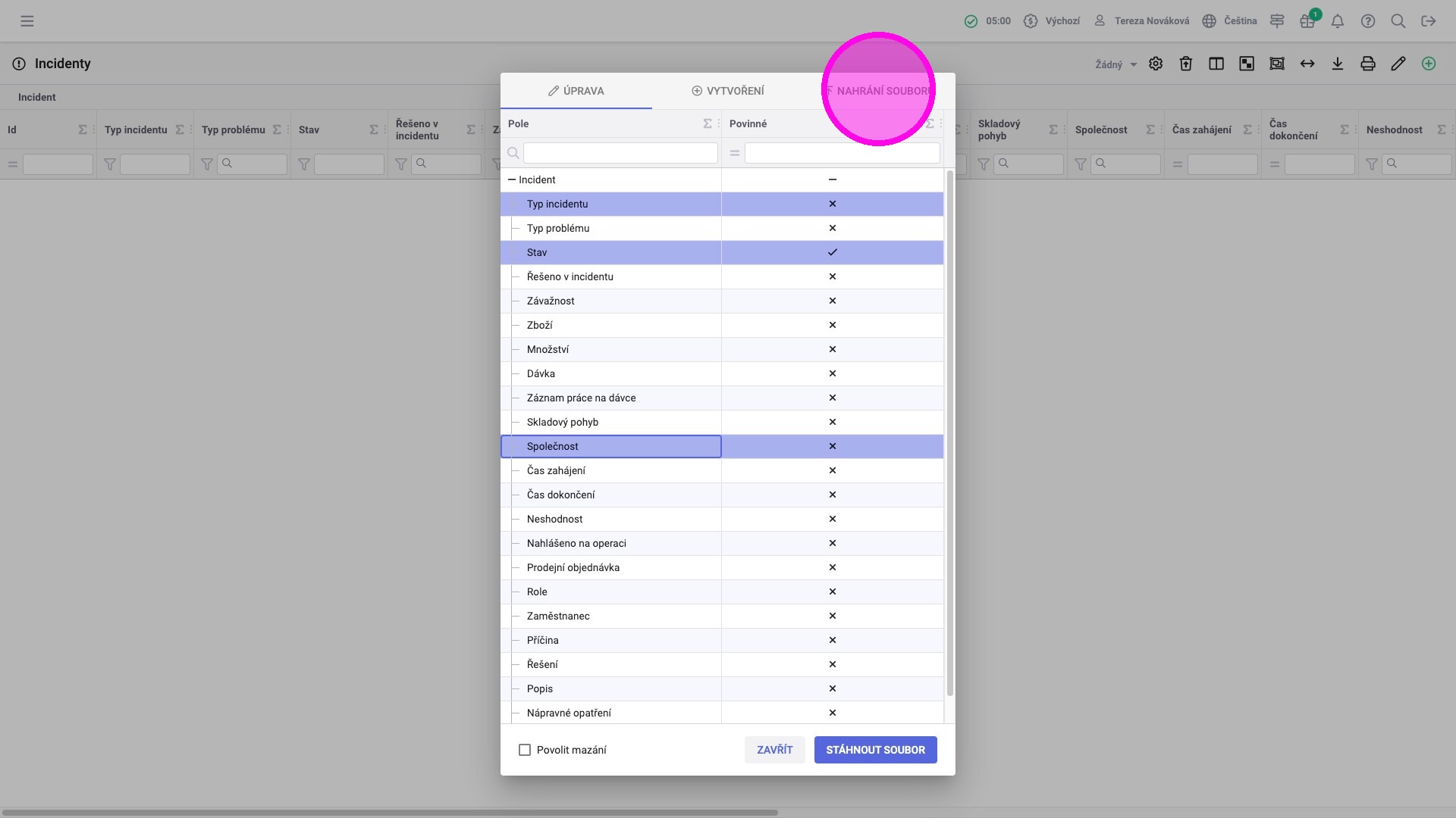 3. Kliknutím na řádky vybrat pole, která je potřeba při vytvoření záznamů naplnit hodnotami. Je potřeba vybrat všechna povinná pole, která nemají výchozí hodnotu, aby mohl být soubor úspěšně nahrán a záznamy byly vytvořeny.