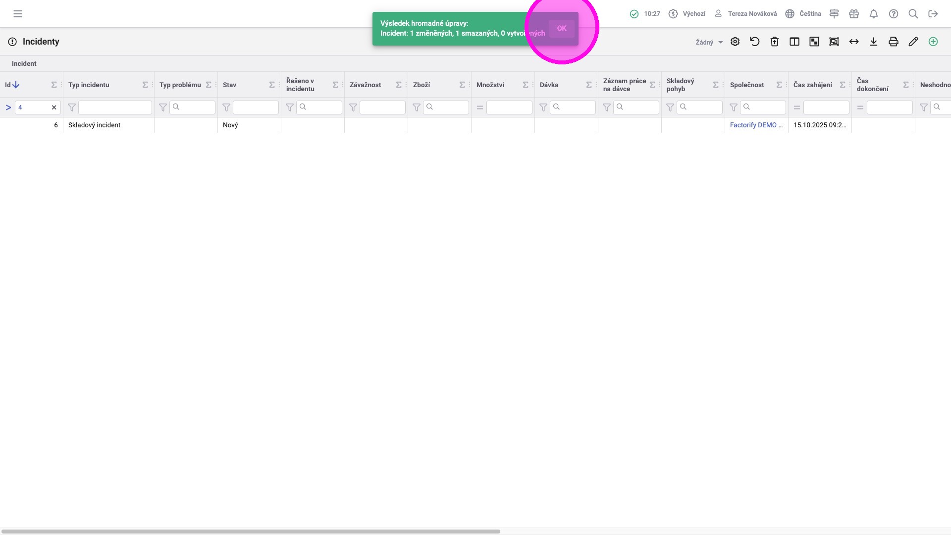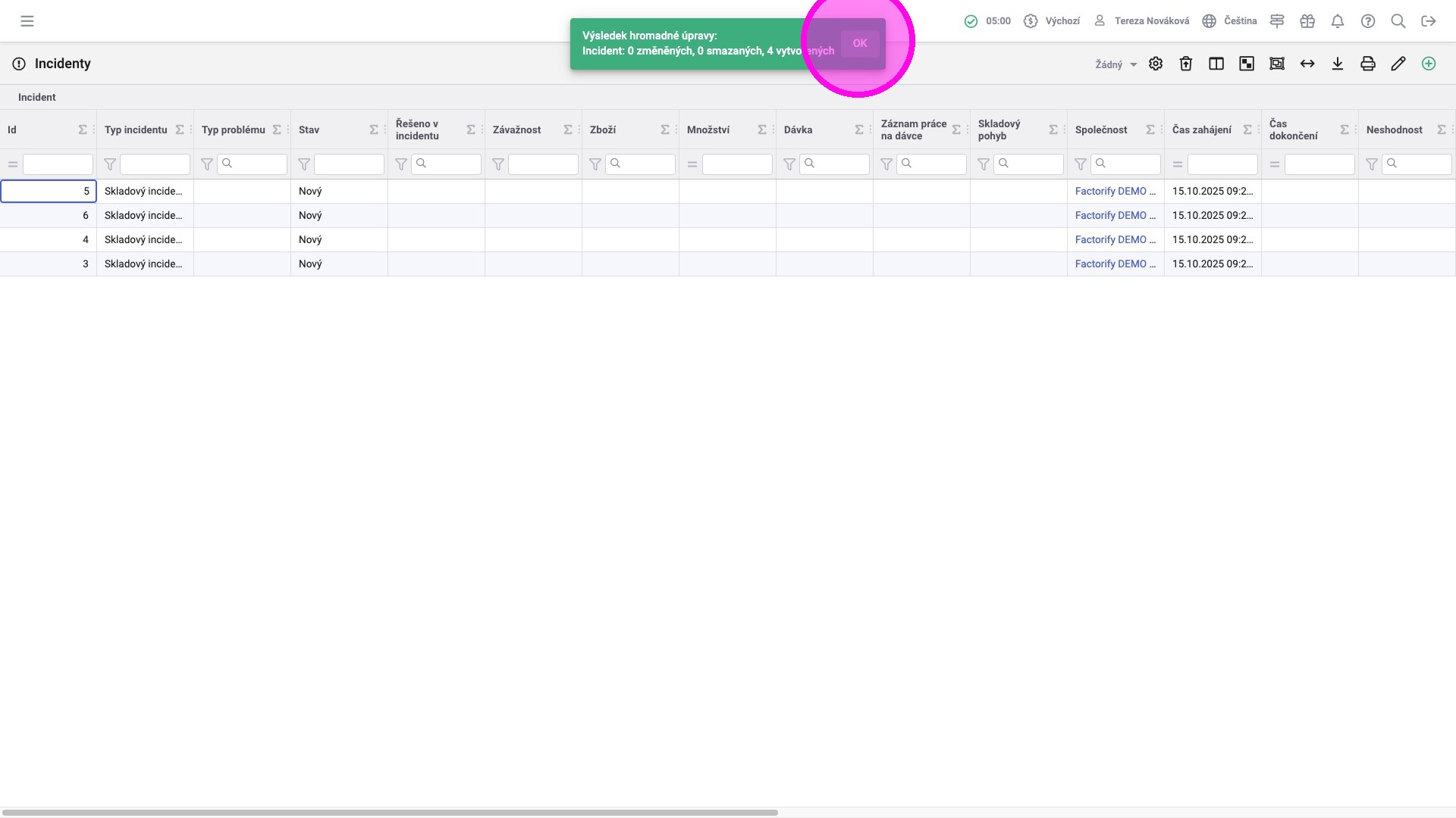 14. Zobrazí se počet změněných a smazaných záznamů. Kliknout "OK" pro uzavření zprávy.