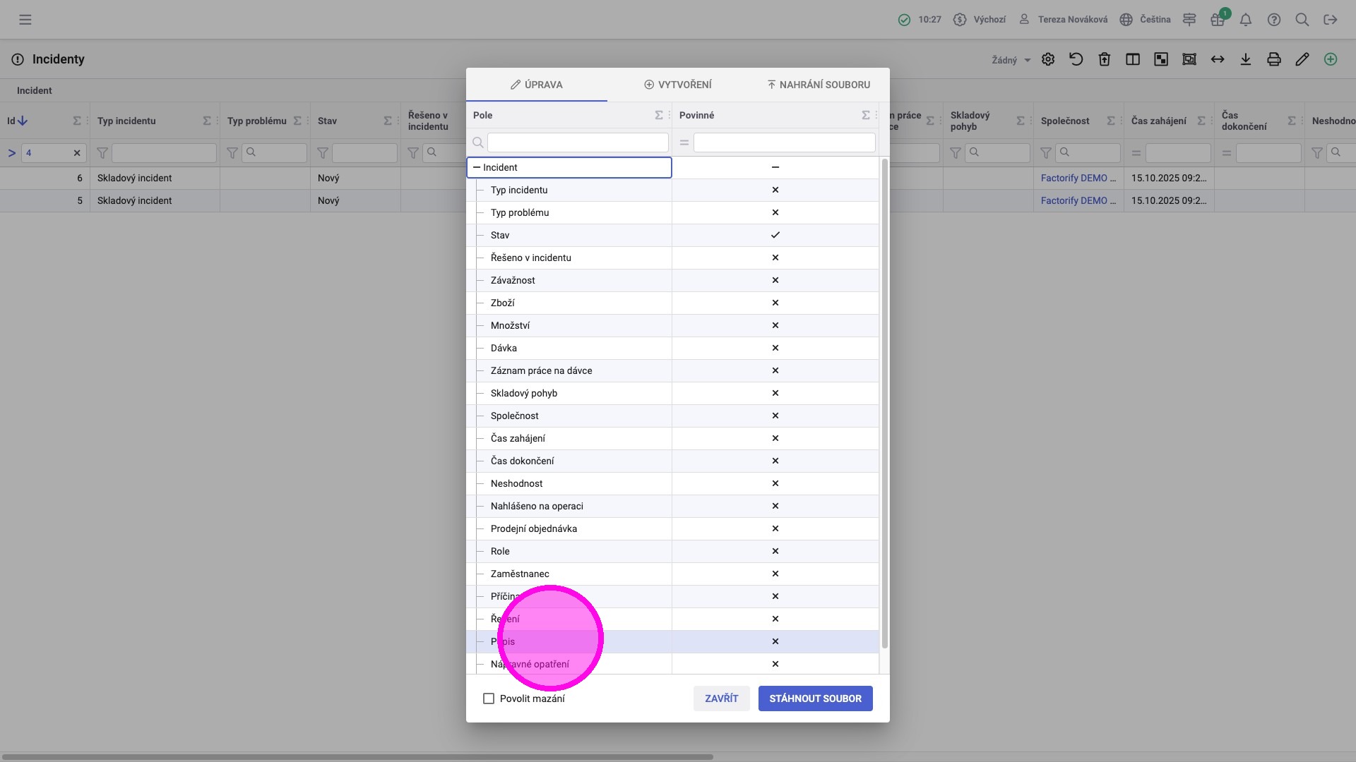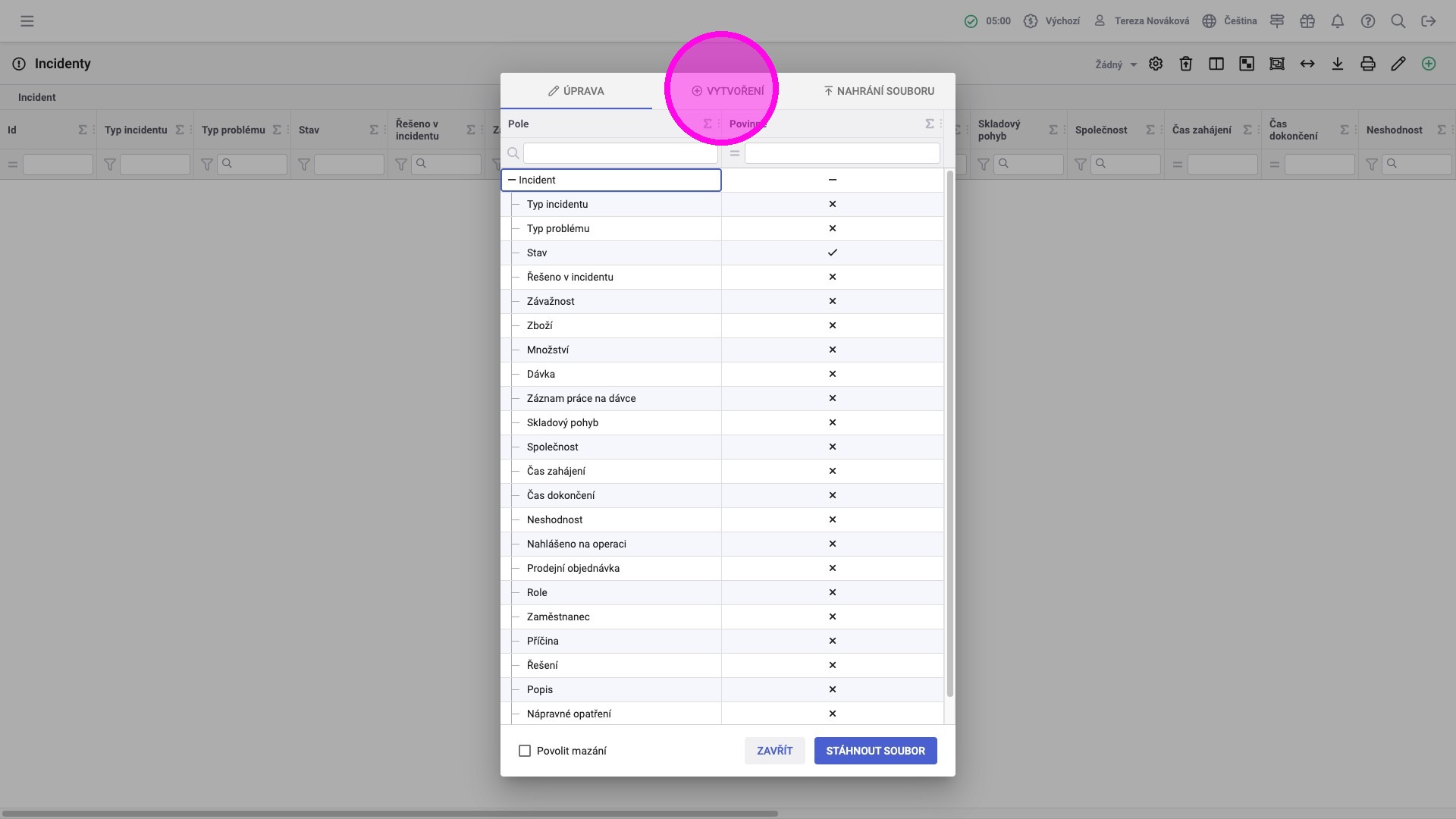 7. Pro pole, jejichž hodnoty jsou přebírány z číselníků (např. Stav, Typ incidentu), je potřeba napsat kód z číselníku odpovídající hodnotě, jenž chceme pro vytvářený záznam v poli zobrazovat.