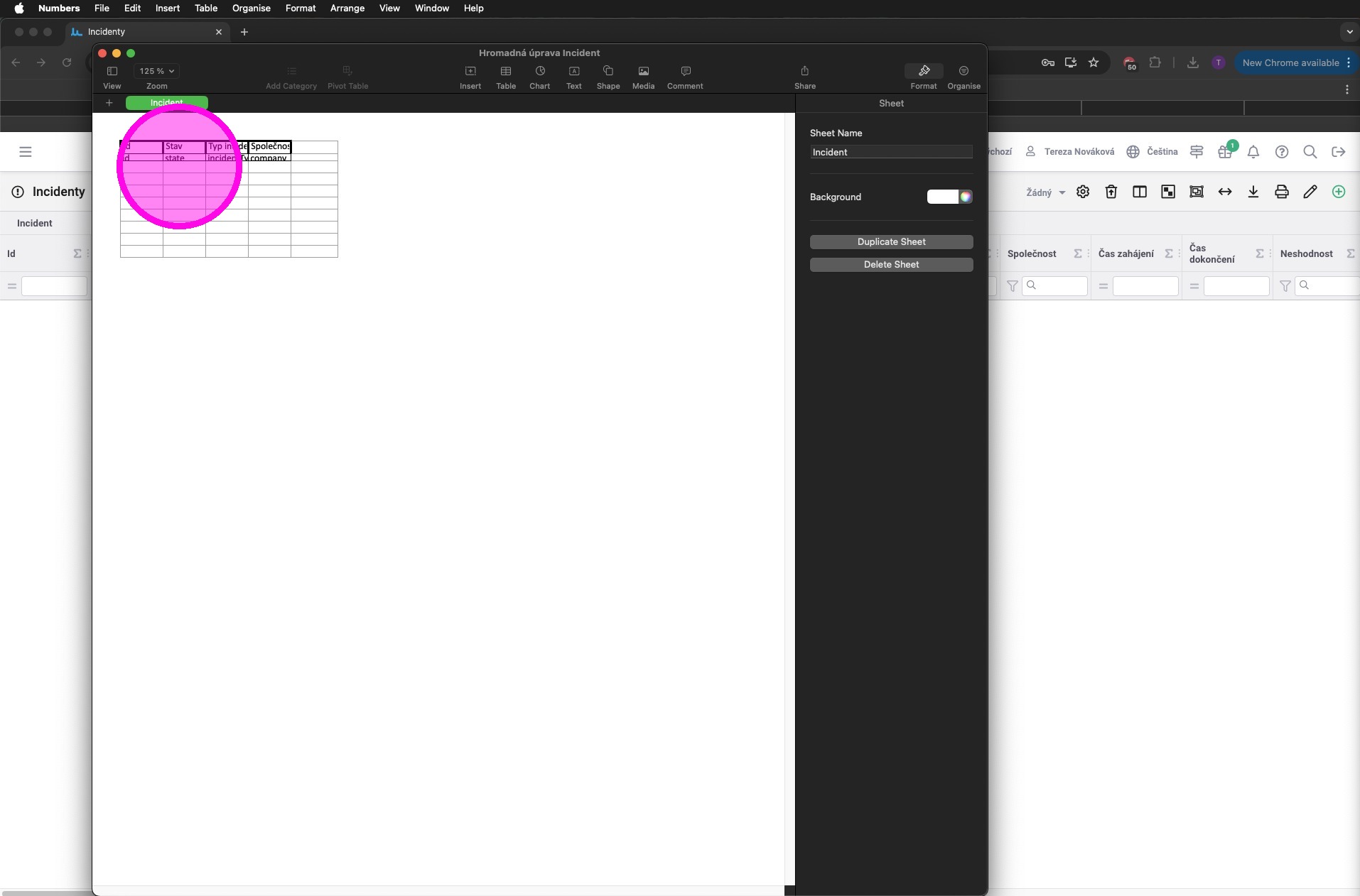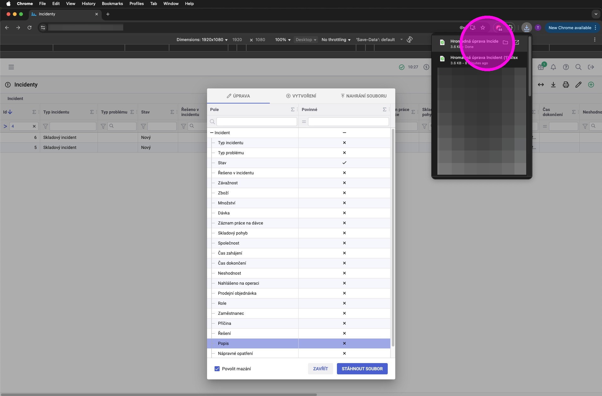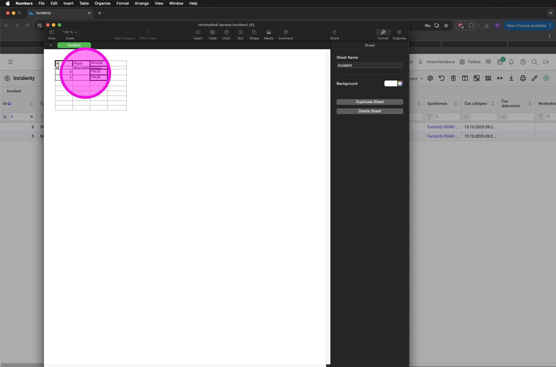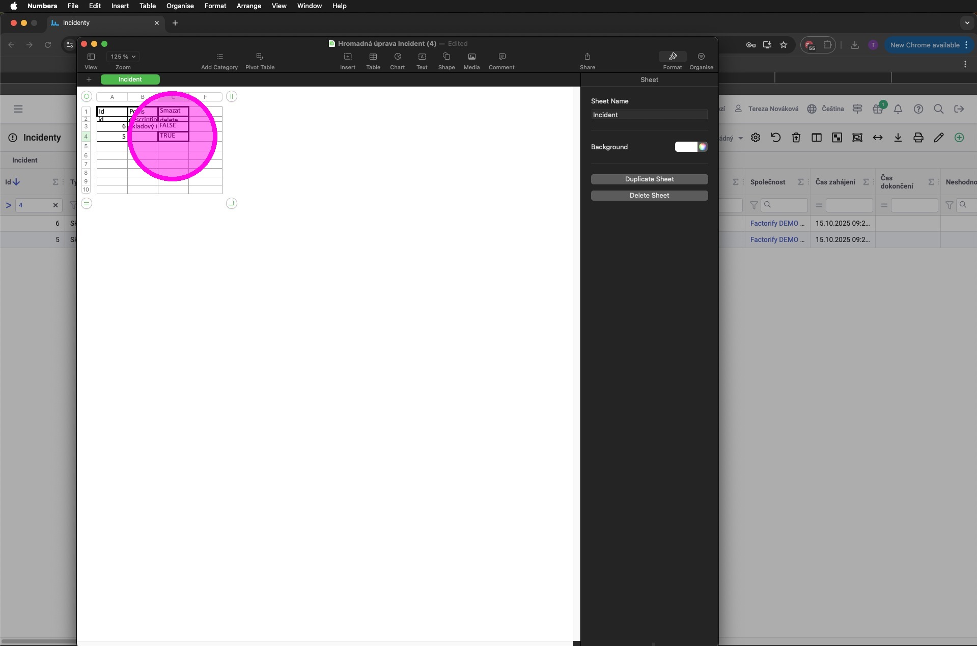 7. Vyplnit pole nebo upravit jejich hodnoty. V souboru jsou pouze zafiltrované záznamy. Také je tam sloupec "delete", jelikož bylo zaškrtnuto pole pro povolení mazání.