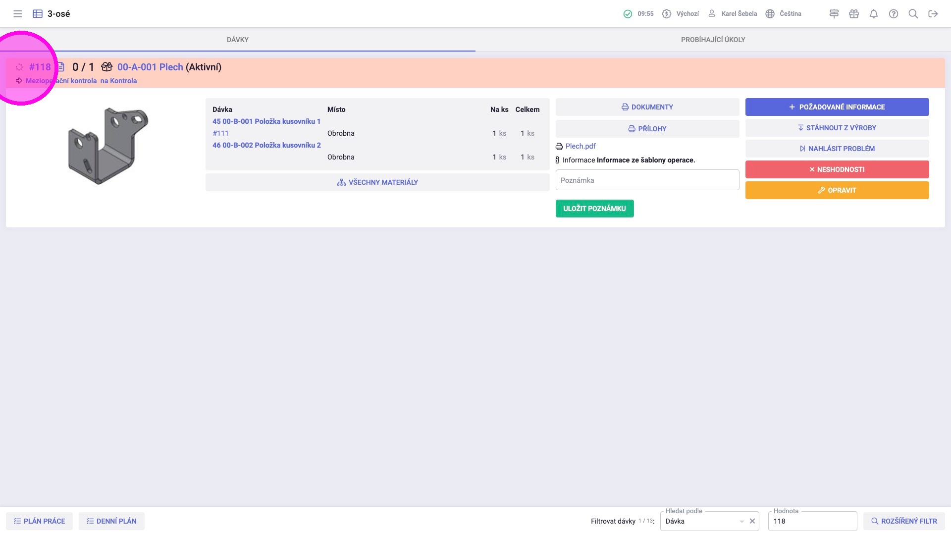 Ke kontrole používá také agendu Plán práce, kde má k dispozici tabulkový přehled všech dávek. Vidí zde jejich aktuální i budoucí operace, jejich plánované začátky a konce, požadované termíny zahájení operací pro včasné dokončení dávky a také informace o dostupnosti potřebného materiálu, ať už na skladě nebo přímo na pracovišti.