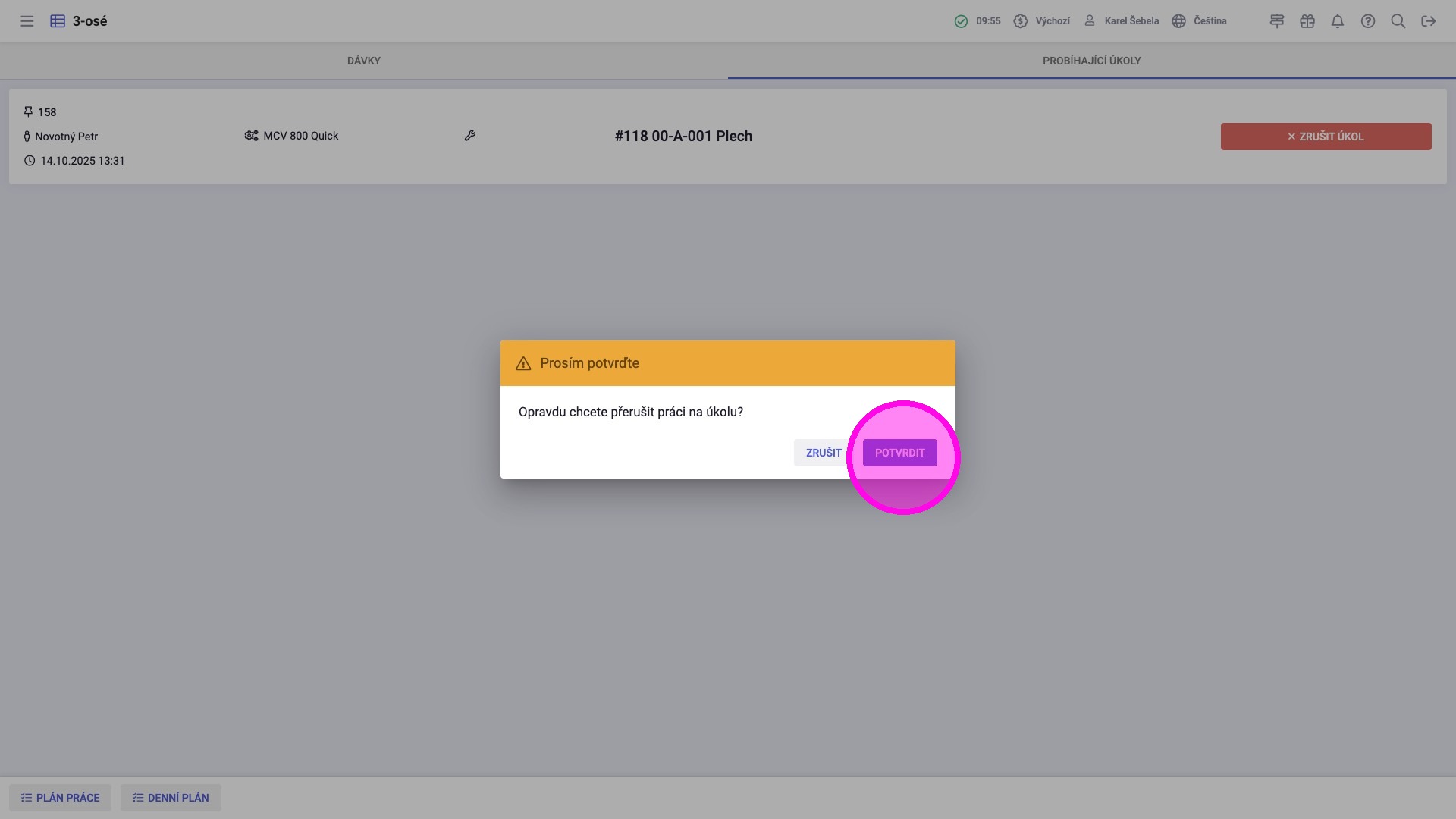Proces přeruší práci daného operátora. Nevznikne žádný záznam práce a dávka zůstává stále na daném pracovišti. Toto se použije, pokud si zaměstnanec omylem nastartoval práci na dávce, na které nemá pracovat.