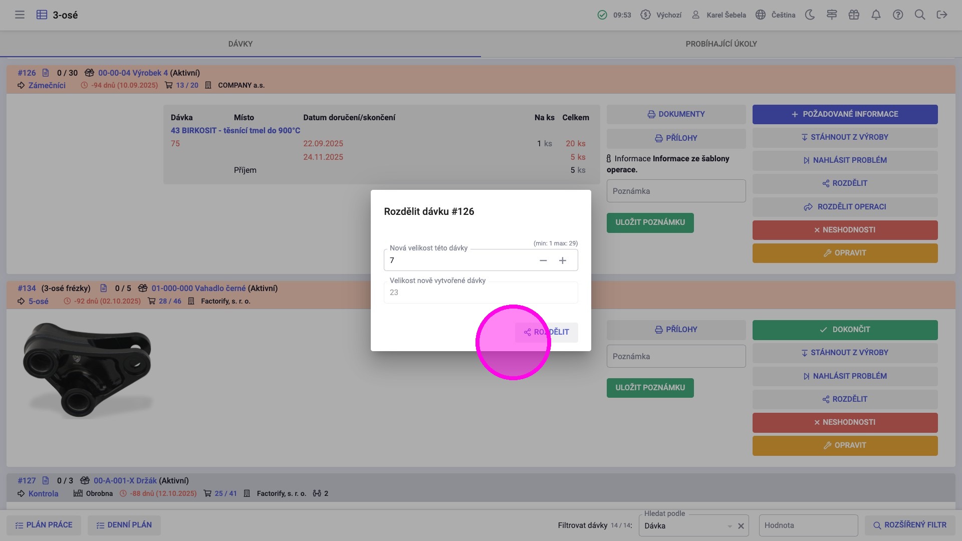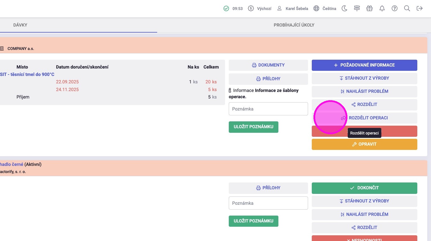10. Při rozdělení dávky je důležité nově vzniklé dávce vytisknout průvodku a označit výrobky.