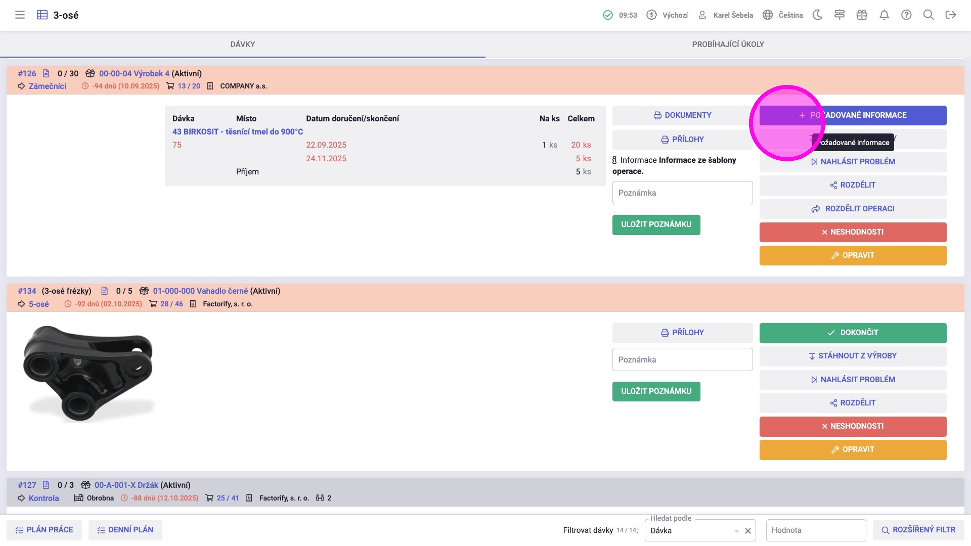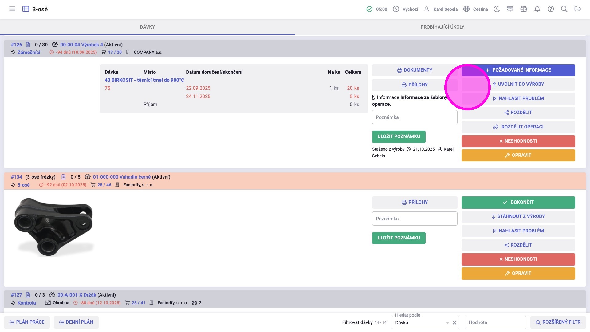 Používané agendy: Plán práce, Naplánované dávky , Dávky, Výroba / pracoviště, Kontrolní panel , Detail zaměstnance, Denní efektivita práce