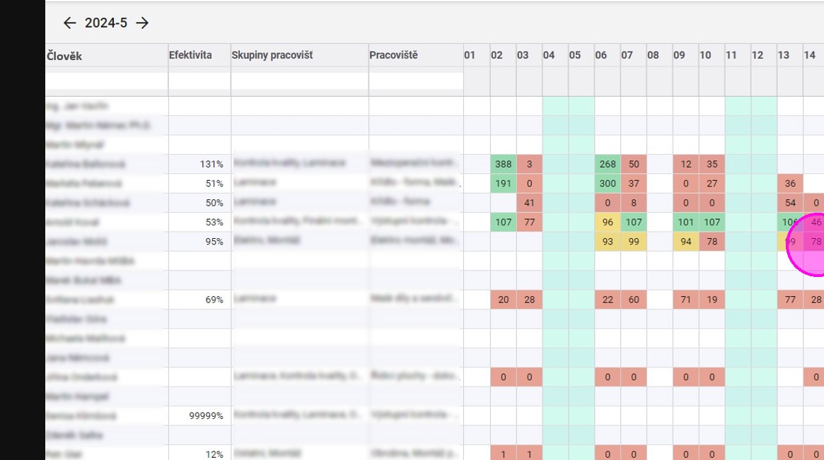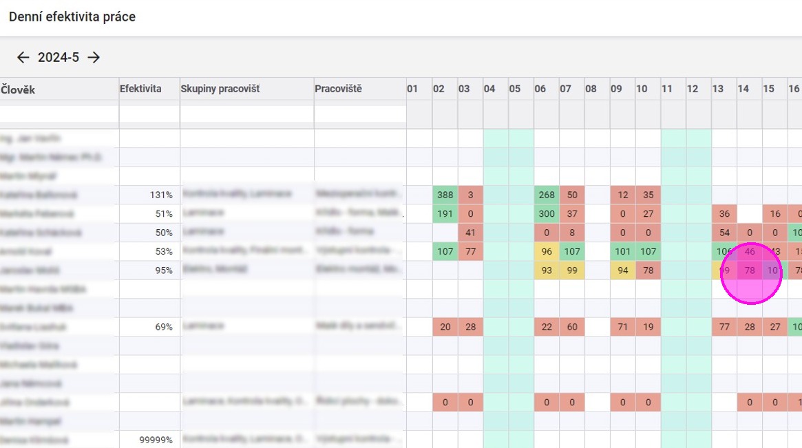 1. V levé části tabulky lze filtrovat dle zaměstnance, měsíční efektivity, skupiny pracovišť a pracoviště. V pravé části tabulky je uvedena efektivita práce dle jednotlivých dní a zaměstnanců. Kliknutí na vybraný den zobrazí denní statistiku.