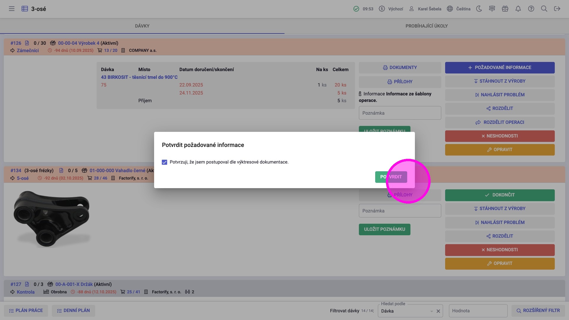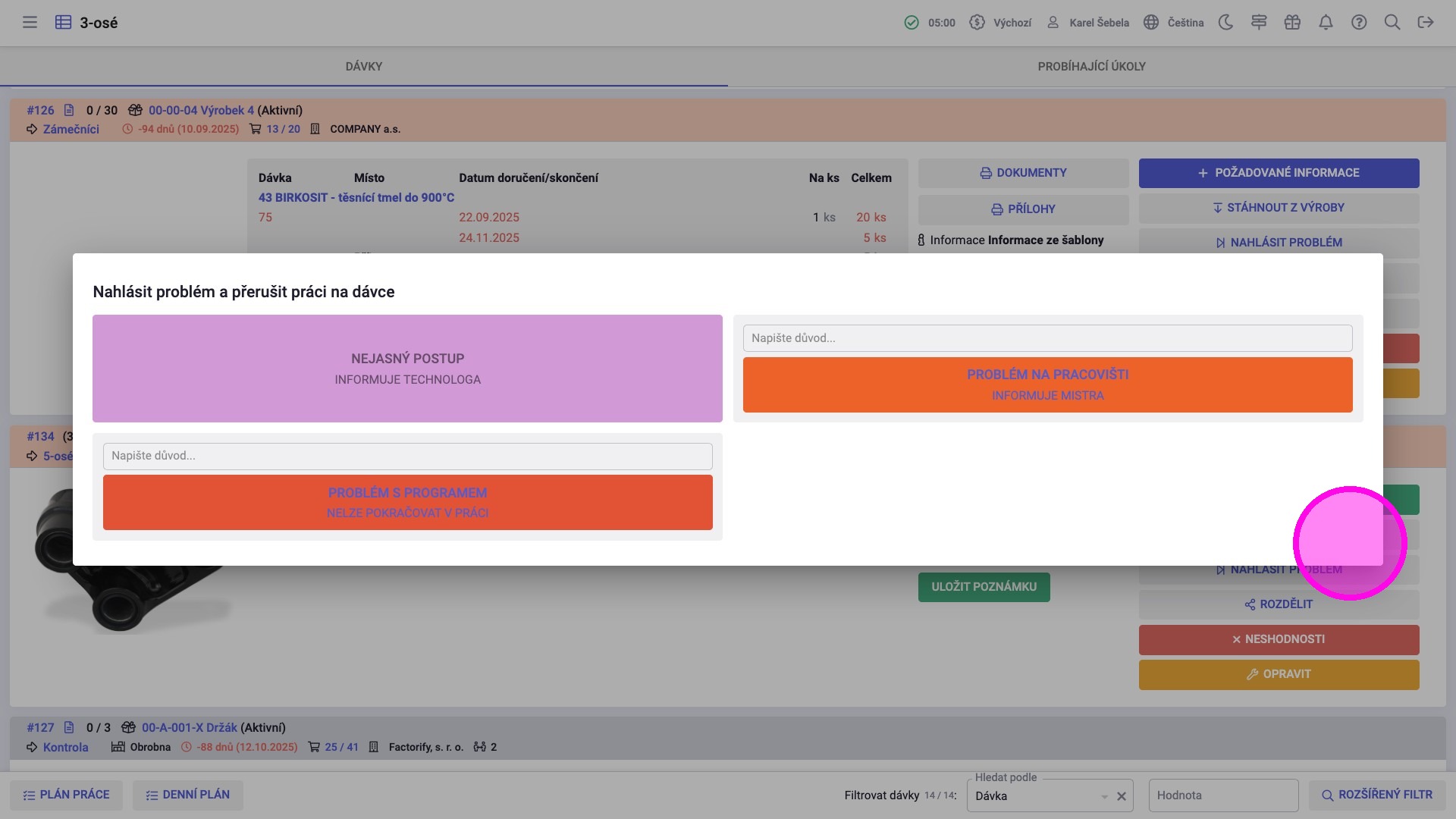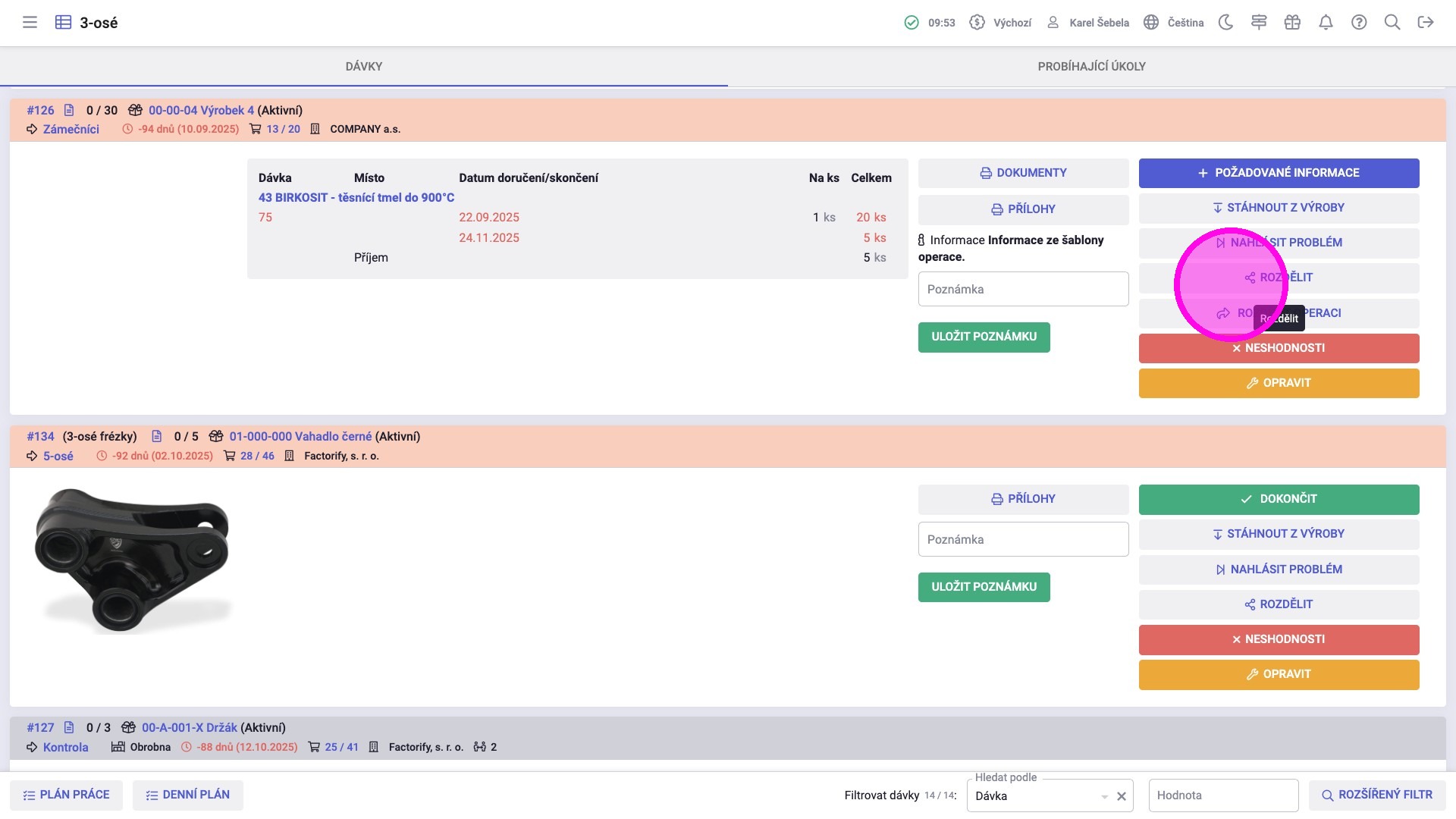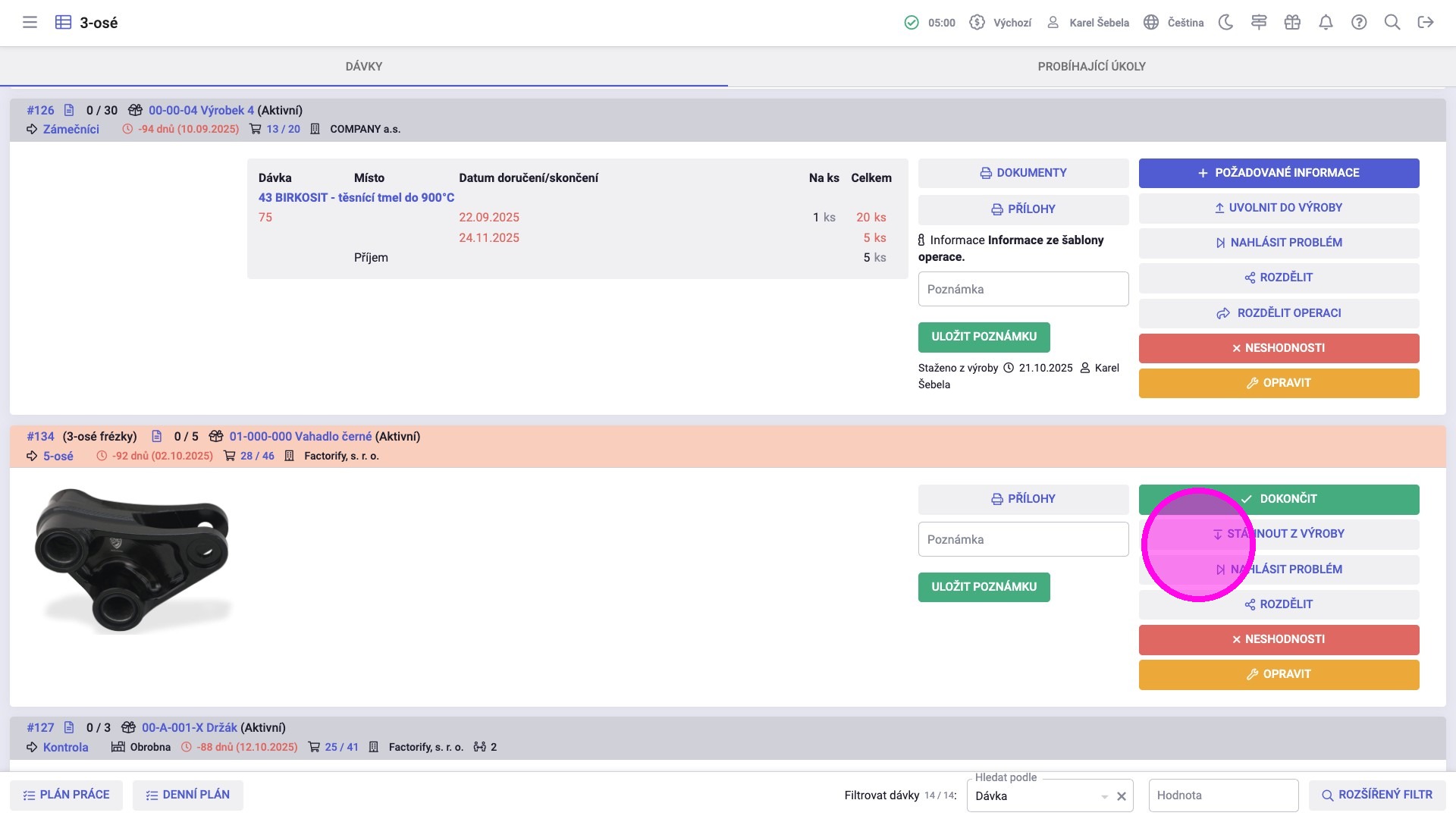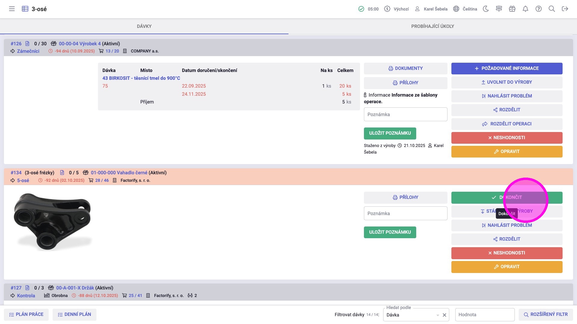 1. Na výrobní obrazovce mistra je na první pohled vidět, na jaké dávce se aktuálně pracuje. Ikonka točícího se kolečka.