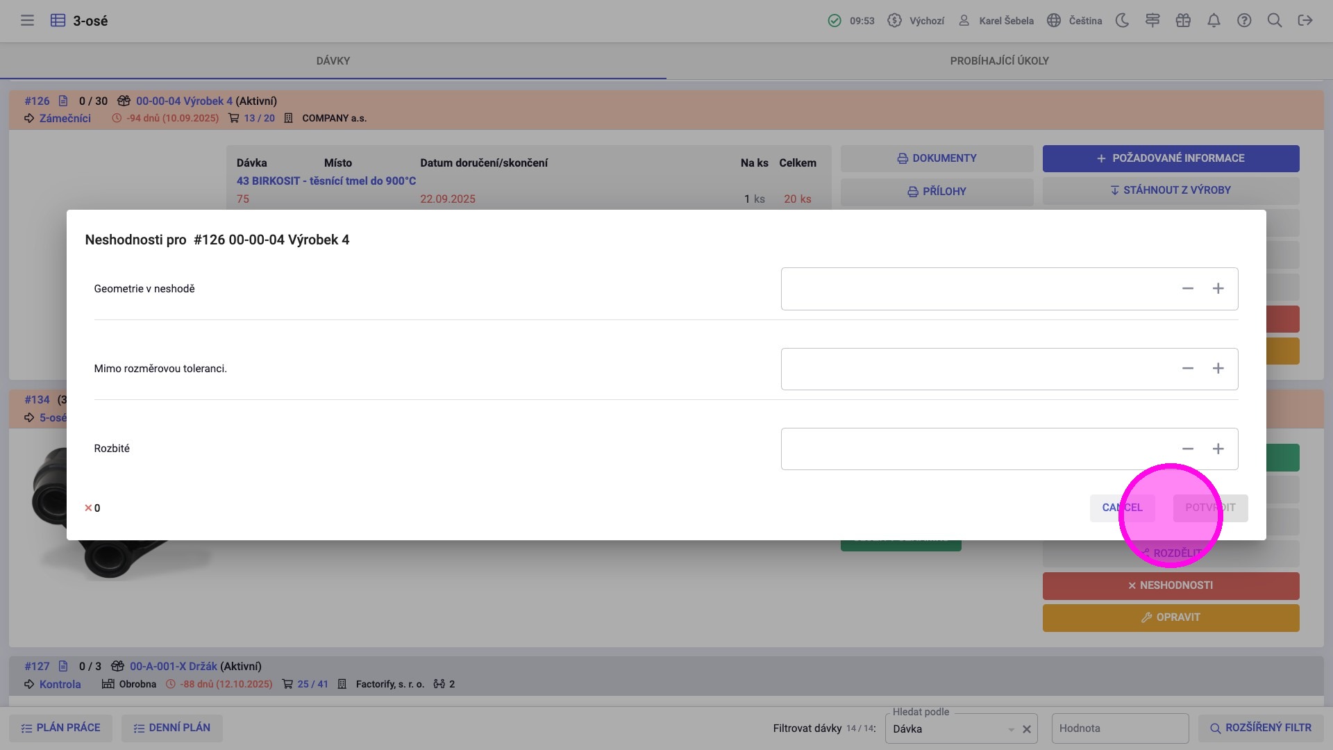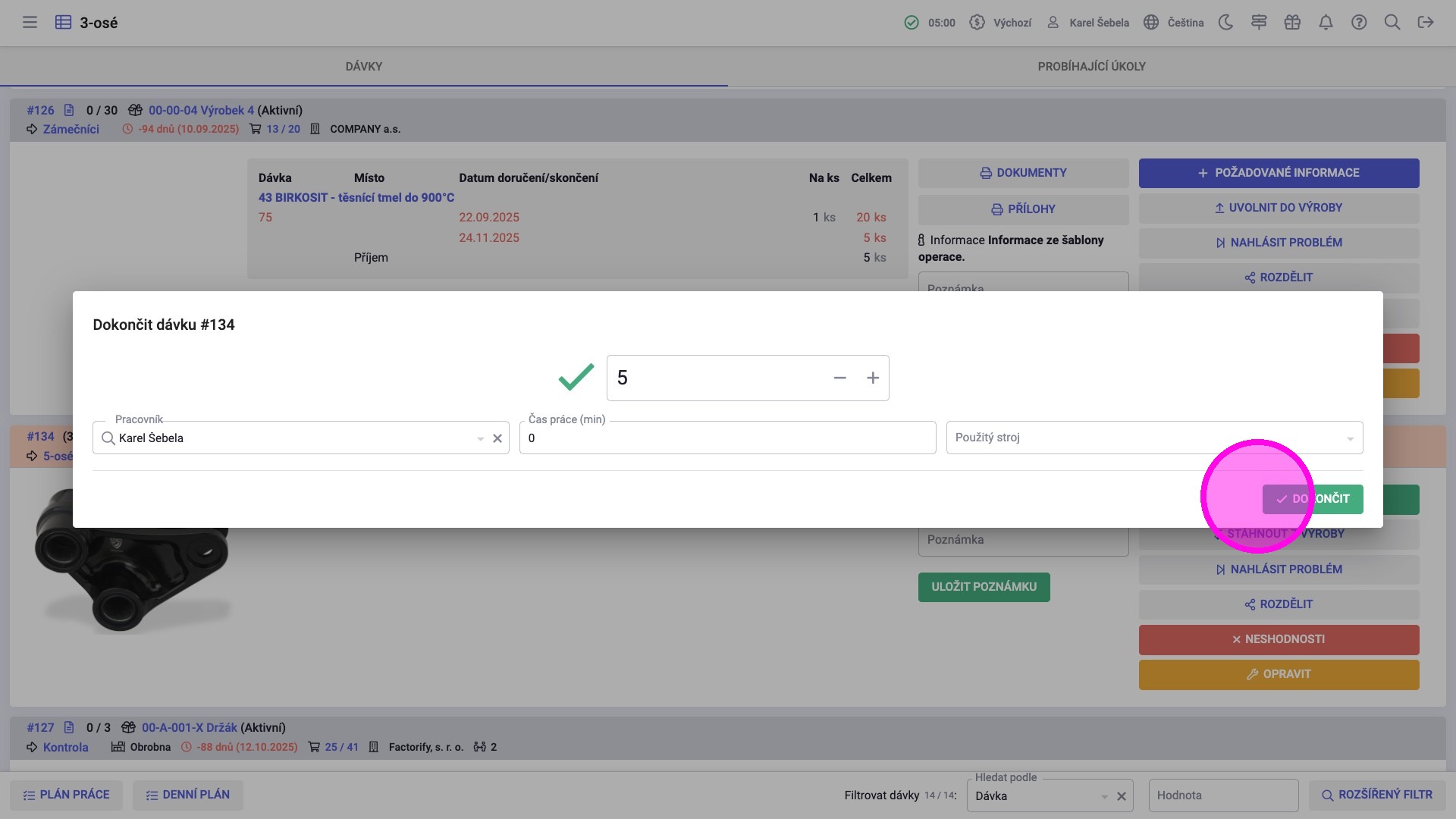 3. Při dokončení výrobní operace mistrem je potřeba zvolit, kolik kusů a za jakého pracovníka práci dokončuje, případně jak dlouho mu práce trvala.