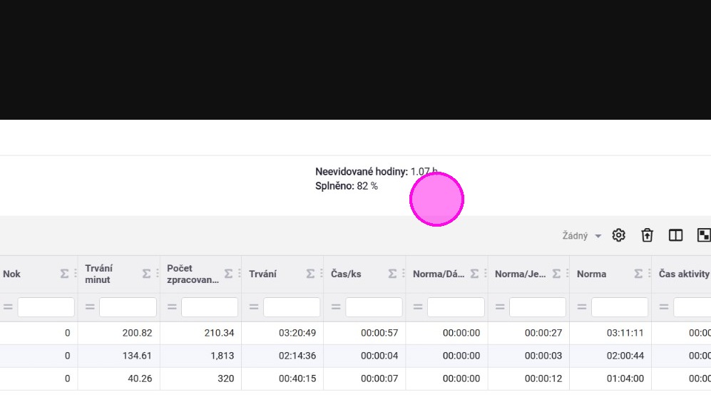 Neevidované hodiny - Přítomnost - Nepracovní hodiny - Pracovní hodiny - součet Trvání záznamů práce