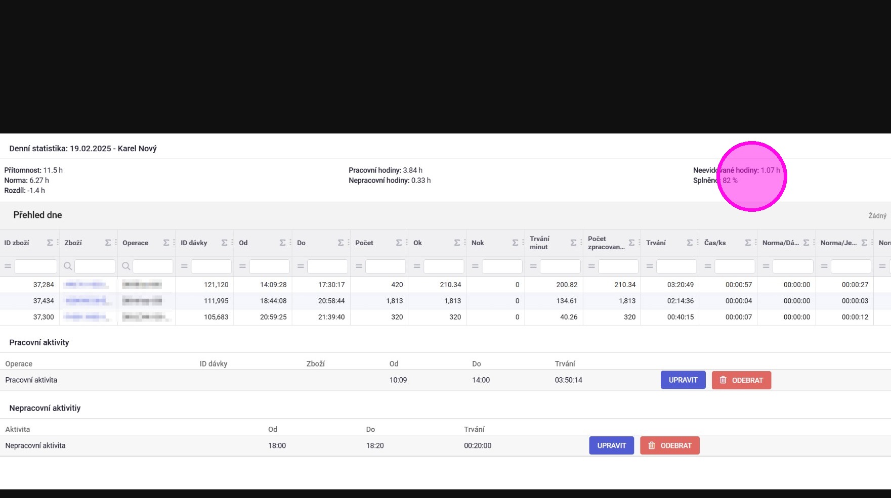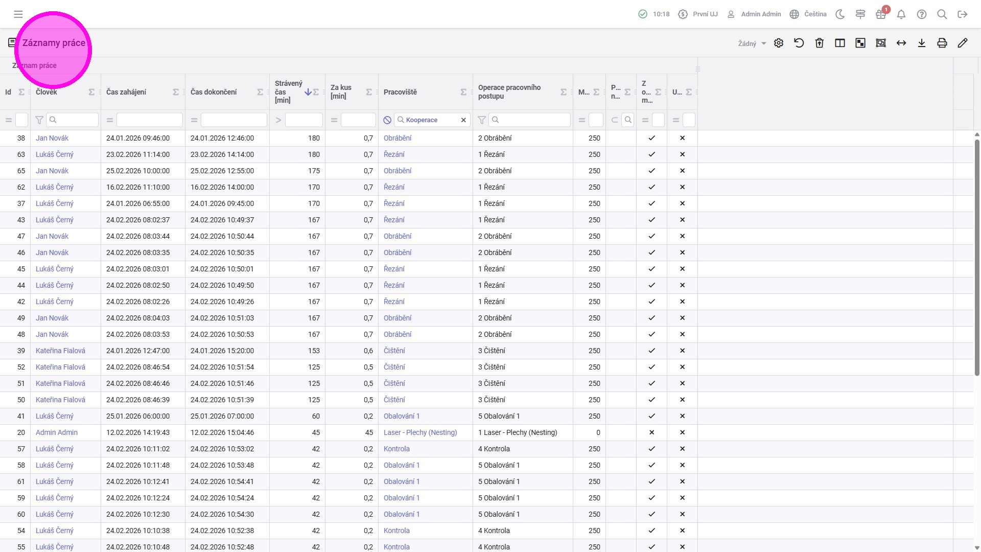 Tato agenda zobrazuje vytvořené záznamy práce. Hodnota ve sloupci "Strávený čas [min]" představuje délku vytvořeného záznamu. Žádný záznam by neměl být o delší hodnotě než 360 minut, jelikož zákonný limit pro pracovní přítomnost bez přestávky je 6 hodin. Každý záznam trvající nad tuto hodnotu by měl být důvodem pro Mistra, aby ověřil, jak a proč k němu došlo.