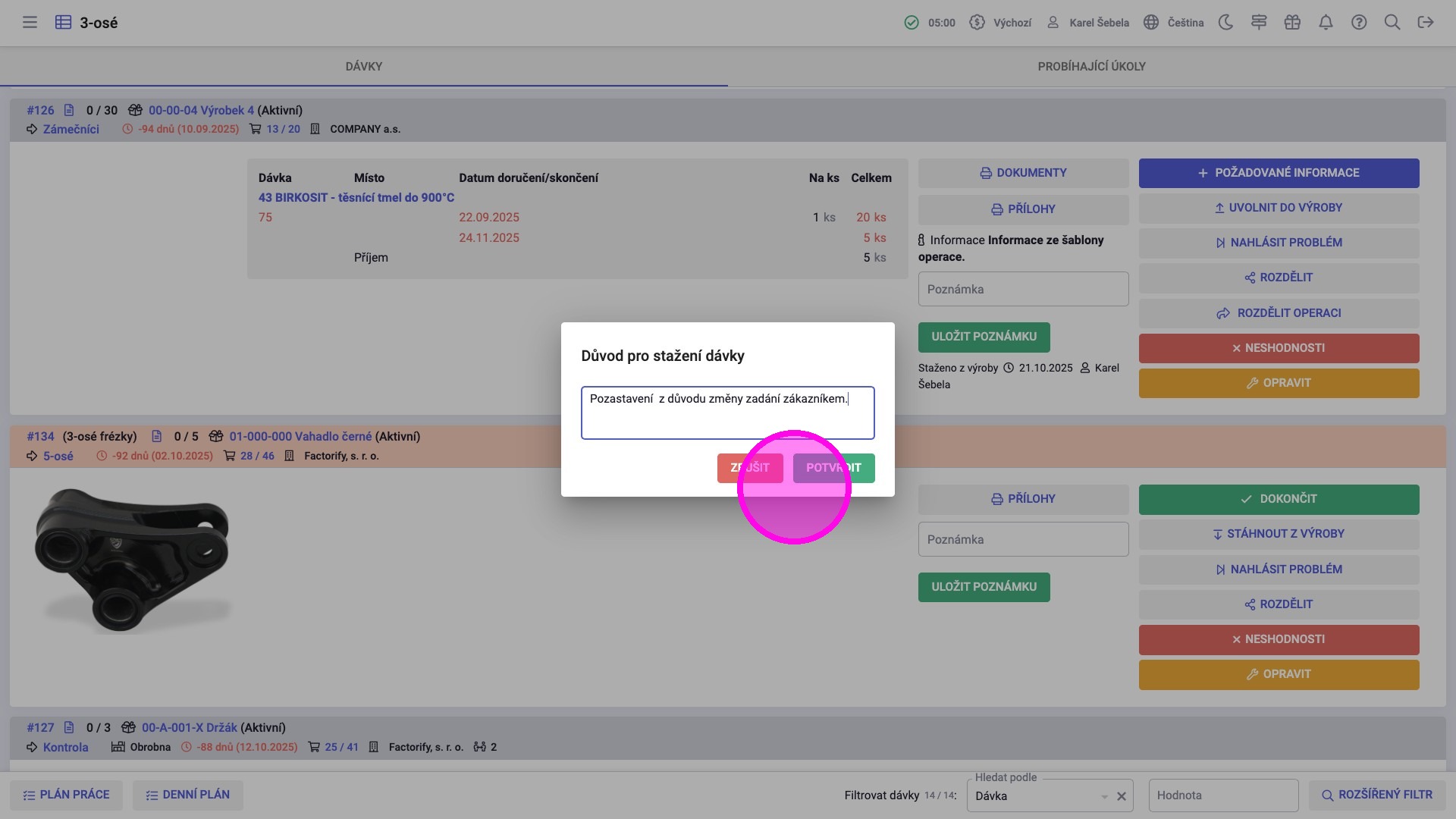 Dávka s akcí Uvolnit do výroby je stažená z výroby a nezobrazuje se operátorům.