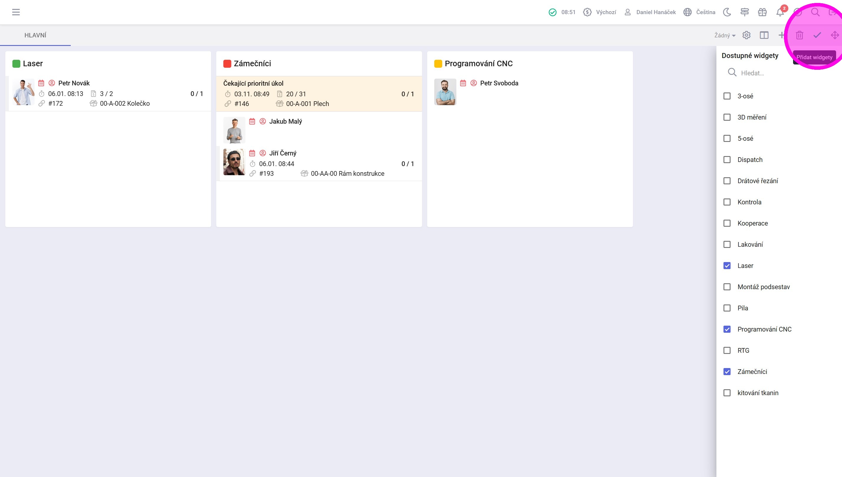 V kontrolním panelu je možné si přidat widgety pracovišť, které chceme monitorovat. Widgety pracovišť se průběžně aktualizují podle práce odvedené na dávkách.
