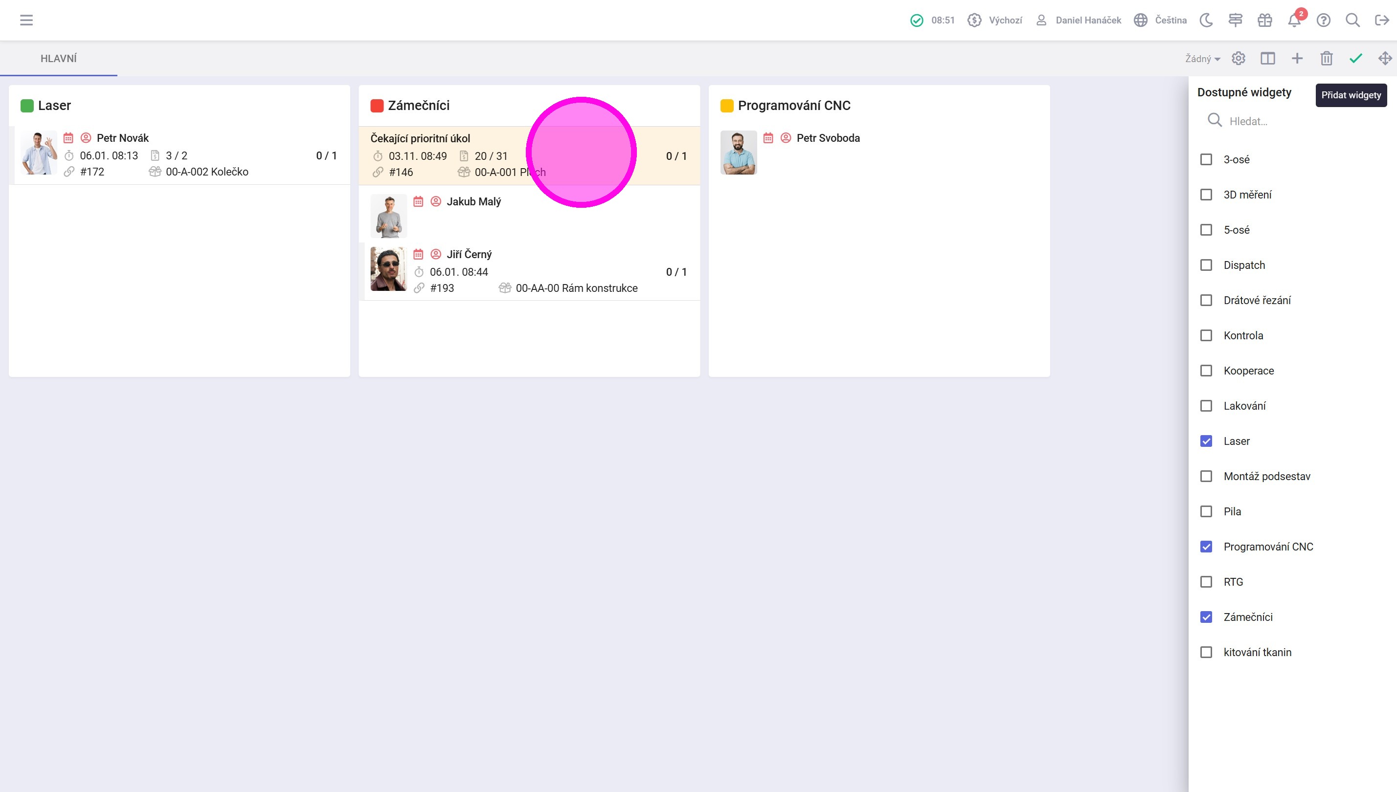 2. Na widgetech pracovišť jsou zobrazeny i naplánované prioritní úkoly s předpokládaným časem začátku práce.