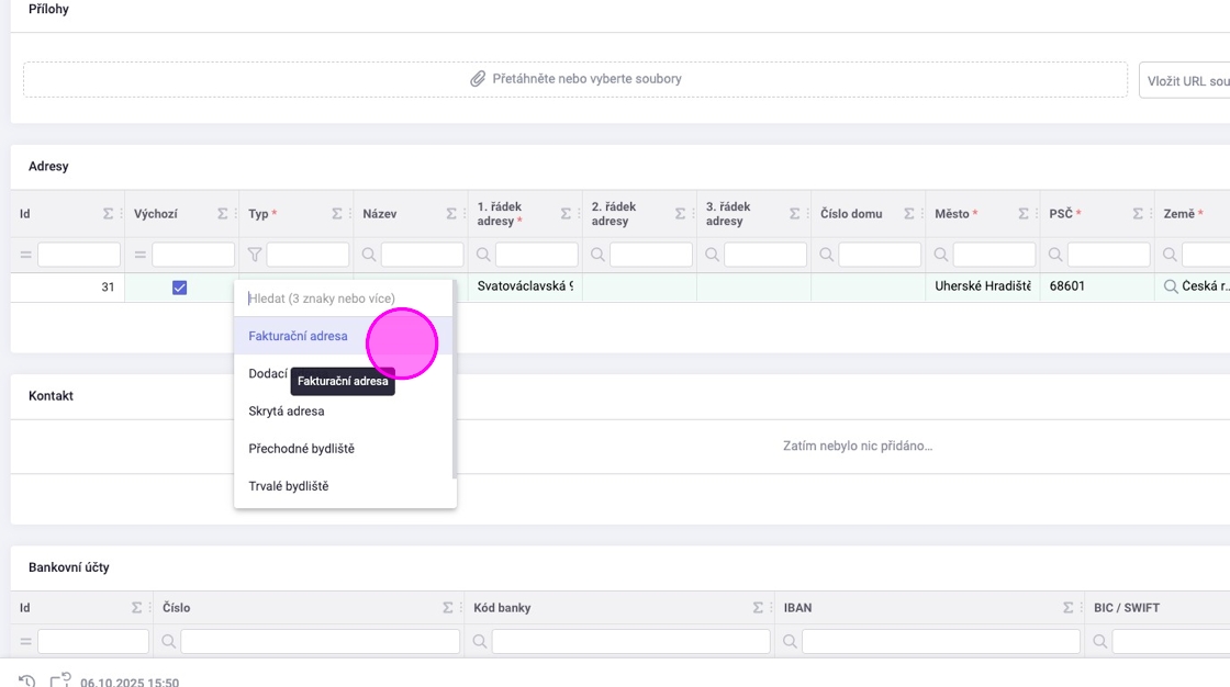 4. Adresa se předvyplnila automaticky z obchodního rejstříku. V případě potřeby je možné vytvořit další fakturační adresu (např. pro zahraniční pobočku) nebo dodací adresy pro různá místa dodání. Fakturační adresu lze vždy použít i jako dodací adresu, ale dodací adresu nelze používat jako fakturační. Pokud existuje více adres, tak lze jednu nastavit jako výchozí a tím se bude automaticky předvyplňovat.