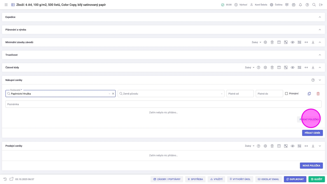2. V „Nákupní ceníky“ kliknout na tlačítko „Přidat ceník“.