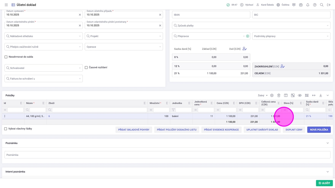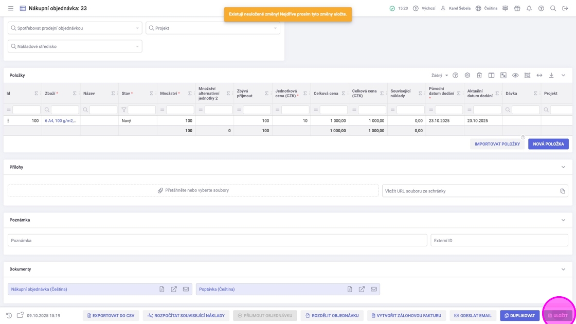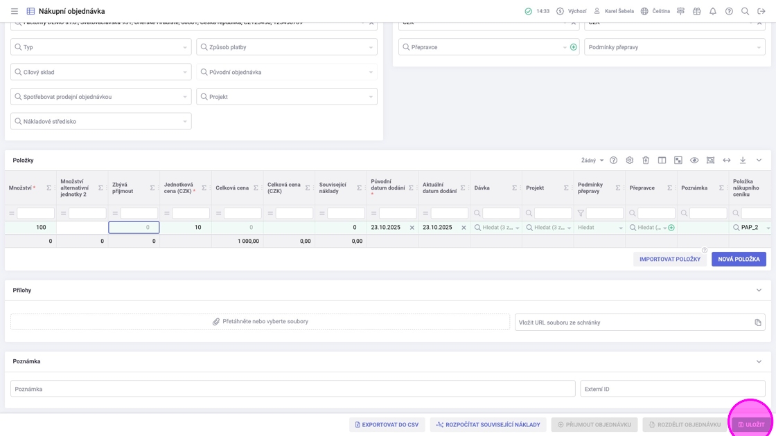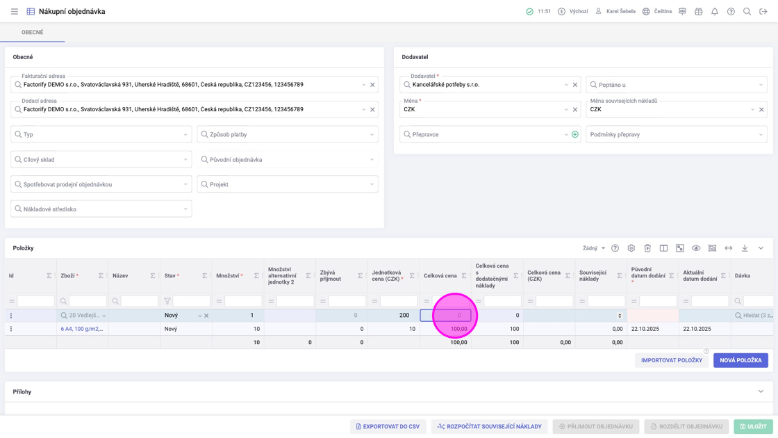 Se správně vyplněným množstvím a měnou objednávky dojde k automatickému doplnění ceny z nákupního ceníku, pokud existuje.