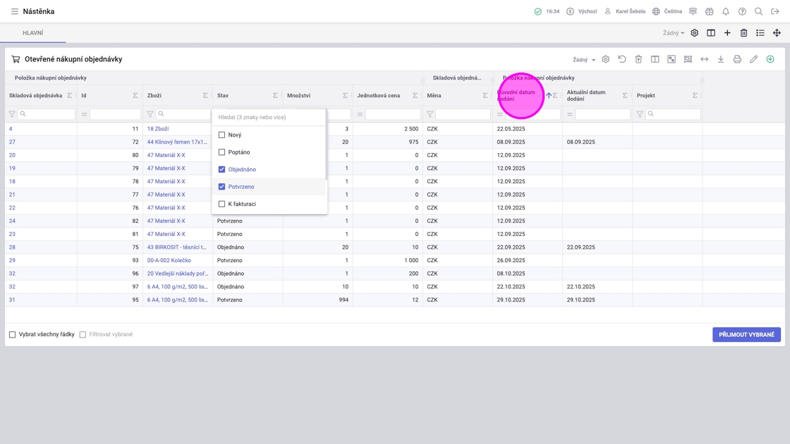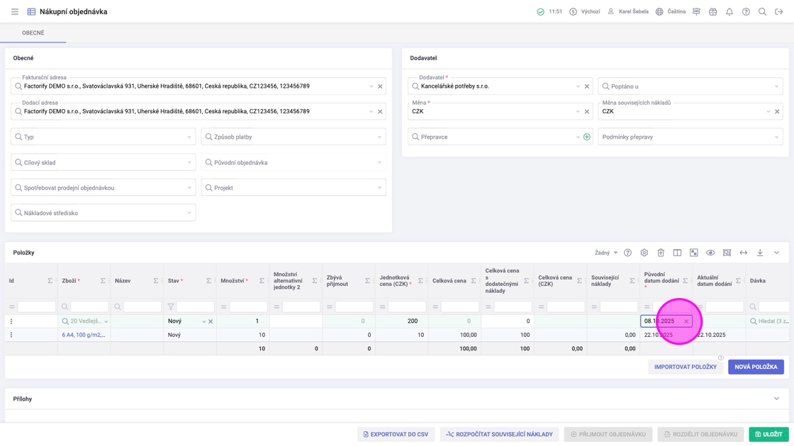 Zadat nové datum do „Aktuálního data dodání“, pokud se v průběhu dodání zboží spozdí. Takto zůstane původní datum nezměněný a vy následně můžete vyhodnocovat dodavatele.