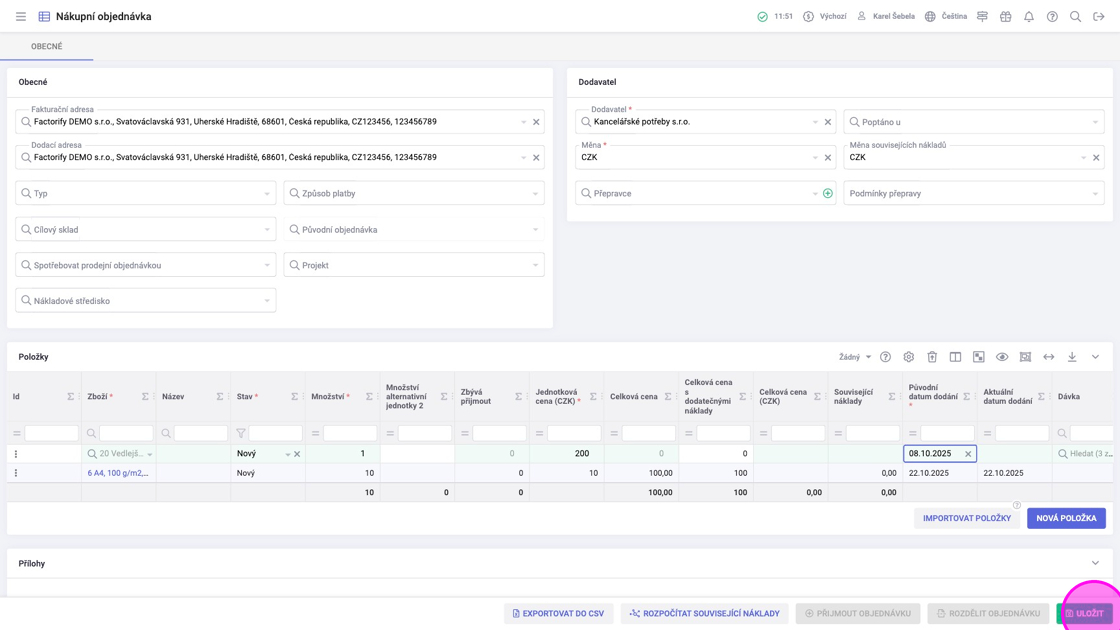 5. Systém automaticky doplní ceny z příslušných nákupních ceníků a nastaví stav objednávky na „Nový“.