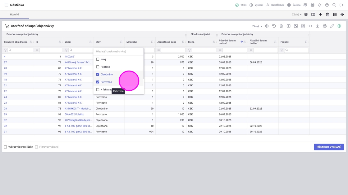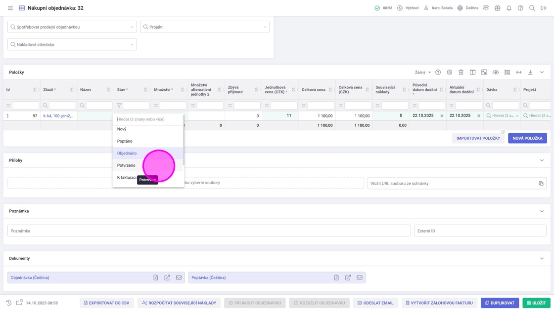 8. Poté, co si s dodavatelem odsouhlasíte množství, ceny a termín nákupní objednávky, přepněte ručně na stav „Potvrzeno“.